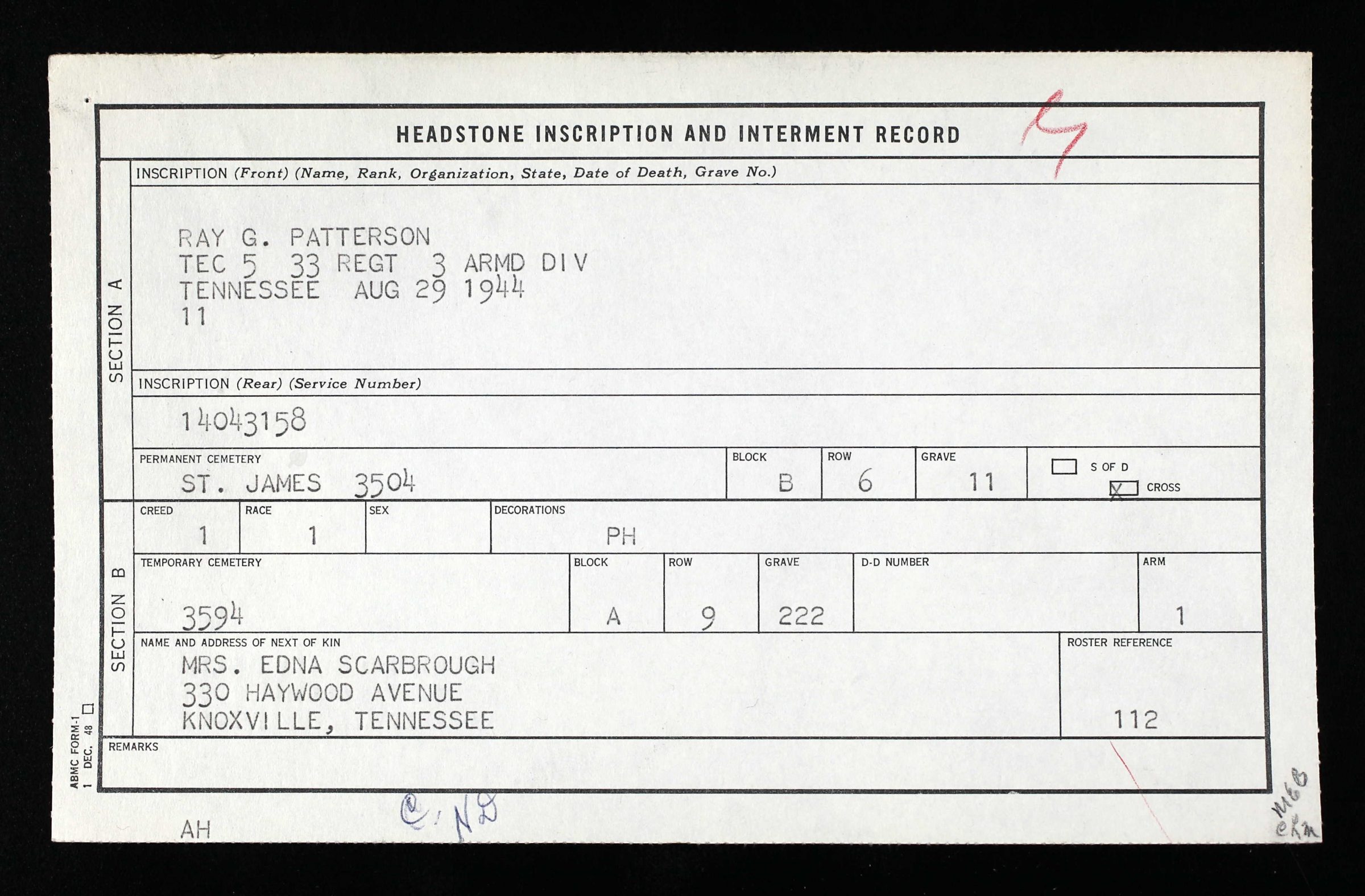 Tec-5 Ray G. Patterson served in the 33rd Armored Regiment, 3rd Armored Division. He died of wounds on 29 August 1944 and was initially buried at Villeneuve-Sur-Auvers Cemetery in Etampes, France and reburied at Brittany American Cemetery, St James, France, B,6,11.