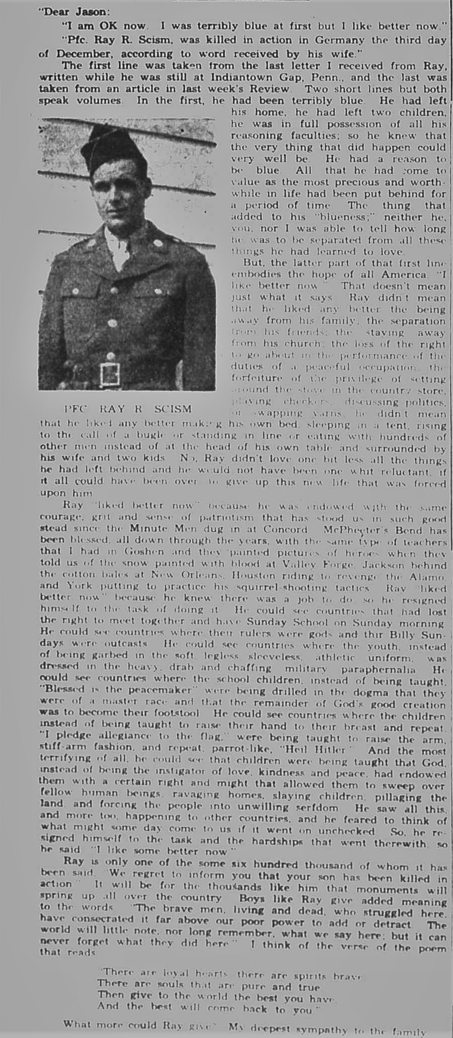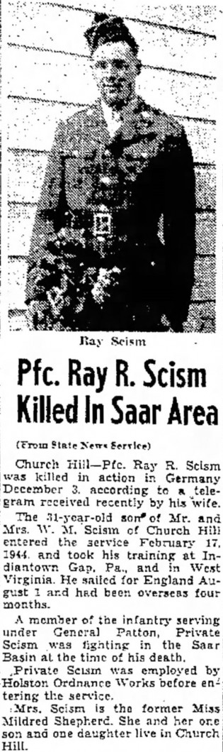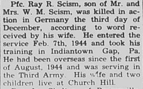 Pfc. Ray R. Scism, son of Mr. and Mrs. W.M. Scism, was killed in action in Germany the third day of December, according to word received by his wife. He entered the service Feb. 7th, 1944 and took his training in Indiantown Gap, Pa. He had been overseas since the first of August, 1944 and was serving in the Third Army. His wife and two children live at Church Hill.