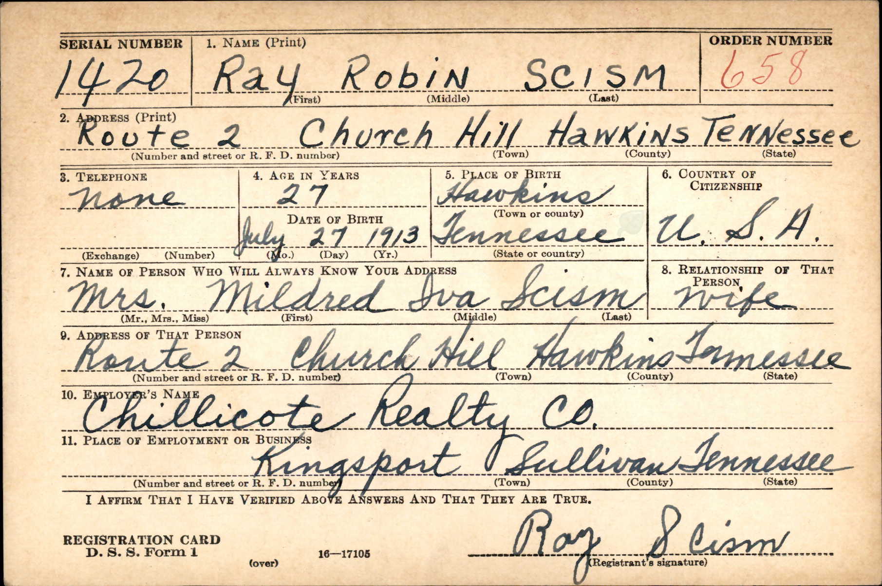 Ray Robin Scism was the son of William M. Scism and Edna Myers. He married Mildred Iva Shepherd in 1936.
