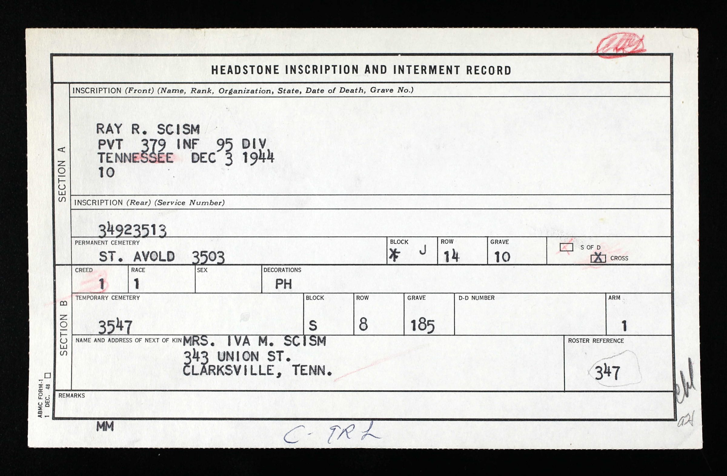 A member of the infantry serving under General Patton, Private Scism was fighting in the Saar Basin at the time of his death.
