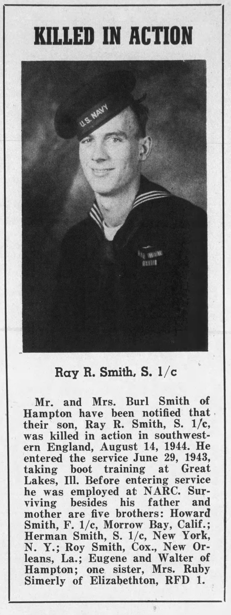 Ray Rex Smith was the son of Burl Wayne Smith and Emma Lou Hall. He entered the service June 29, 1943, taking boot training at Great Lakes, Ill. Before entering service he was employed at NARC. Surviving besides his father and mother are five brothers; Howard Smith, F.1/c, Morrow Bay, Calif.; Herman Smith, S /1c, New York, N.Y.; Roy Smith, Cox., New Orleans, La.; Eugene and Walter of Hampton; one sister, Mrs. Ruby Simerly of Elizabethton, RFD 1.
