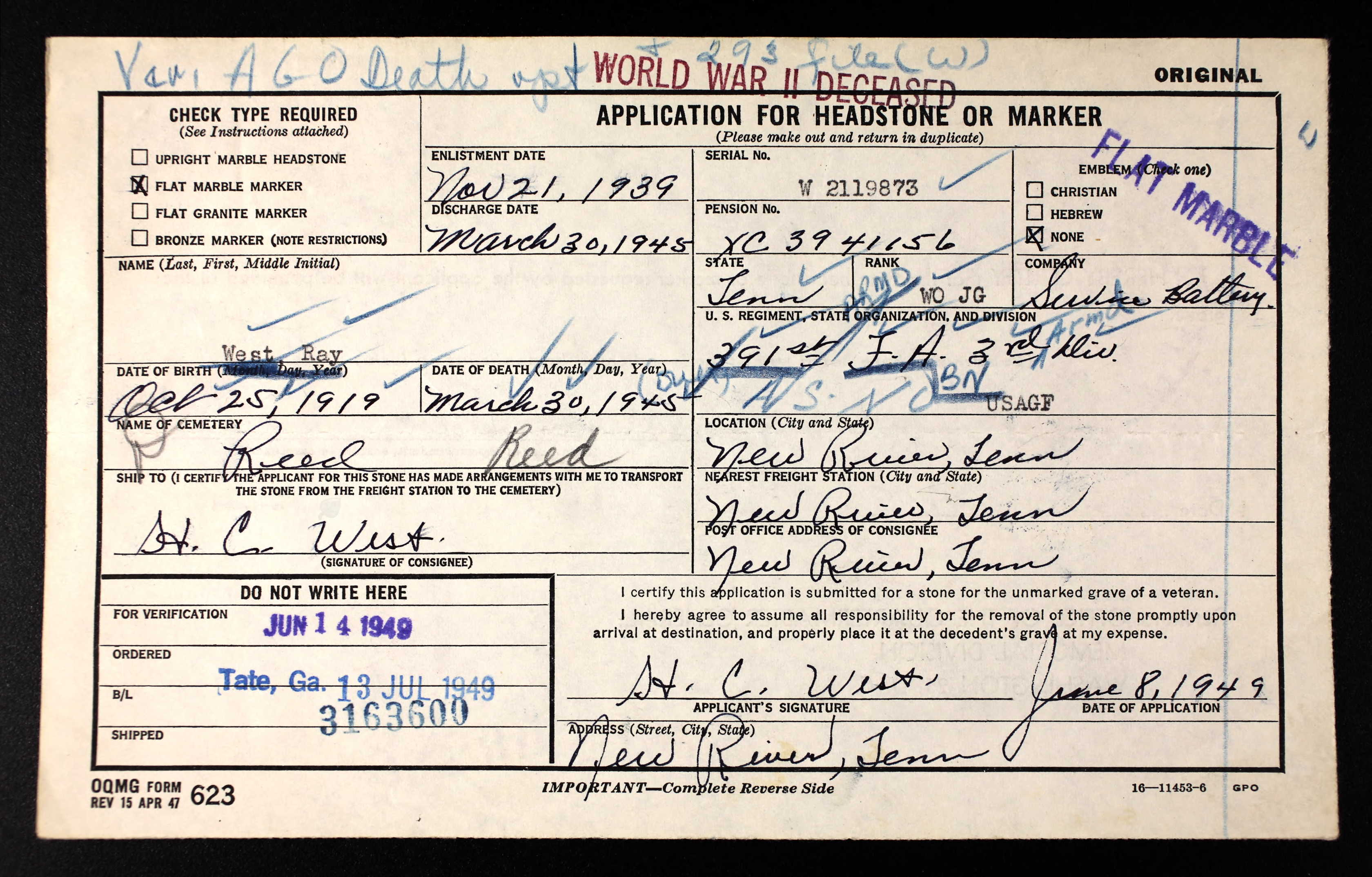 Ray West was the son of Henry Claborn West and Clara D. Phillips. His brother, Clarence B. West was also killed in action during WWII.