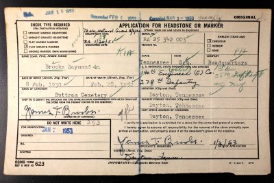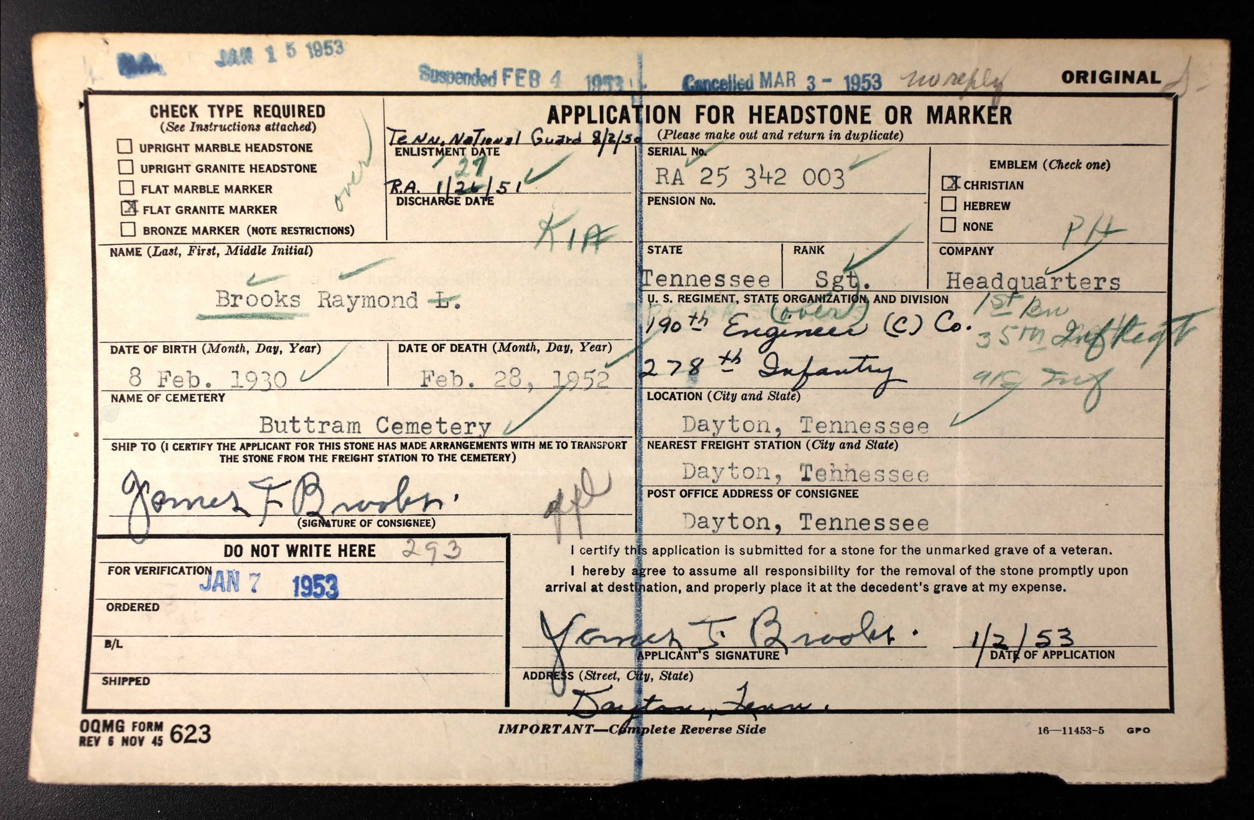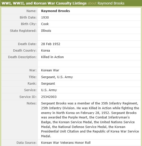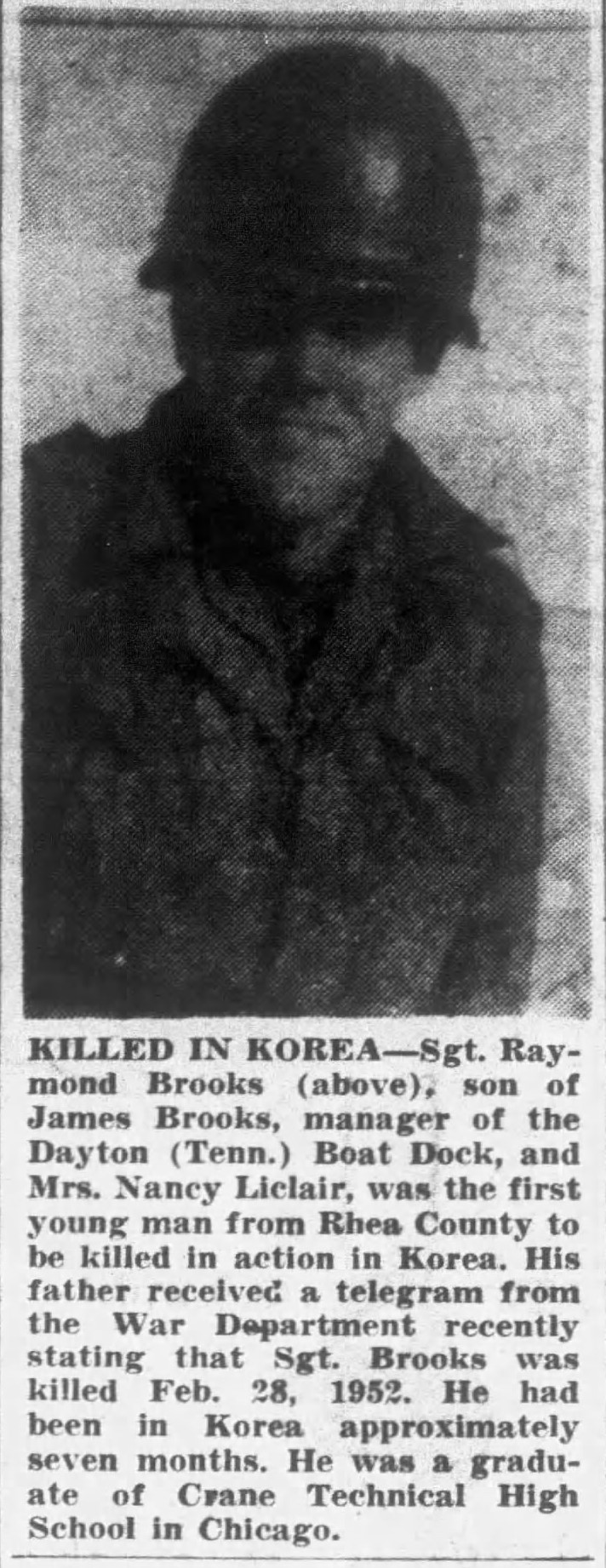 Sgt. Raymond Brooks, son of James Brooks, manager of the Dayton (Tenn.) Boat Dock, and Mrs. Nancy Liclair, was the first young man from Rhea County to be killed in action in Korea. His father received a telegram from the War Department recently stating that Sgt. Brooks was killed Feb. 28, 1952. He had been in Korea approximately seven months. He was a graduate of Crane Technical High School in Chicago.