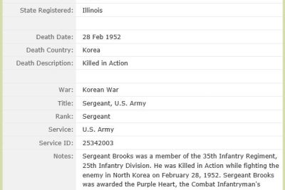 Sergeant Brooks was a Combat Construction Specialist with the 35th Infantry Regiment, 25th Infantry Division. He was Killed in Action while fighting the enemy in North Korea.