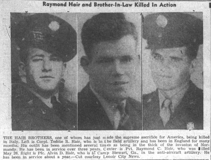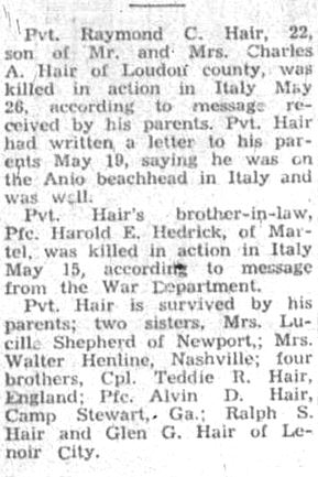 Pvt Hair’s brother-in-law, Pfc Harold E. Hedrick of Martel, was killed in action in Italy May 15.