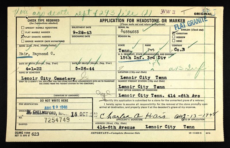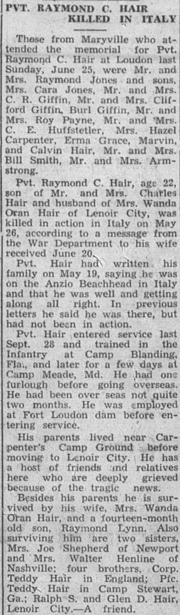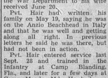 Raymond Charles Hair was the son of Charlie A. Hair and Anna Elizabeth Giffin. He was killed in action in Italy, May 26. Pvt Hair had written a letter to his parents May 19, saying he was on the Anzio beachhead in Italy and was well.