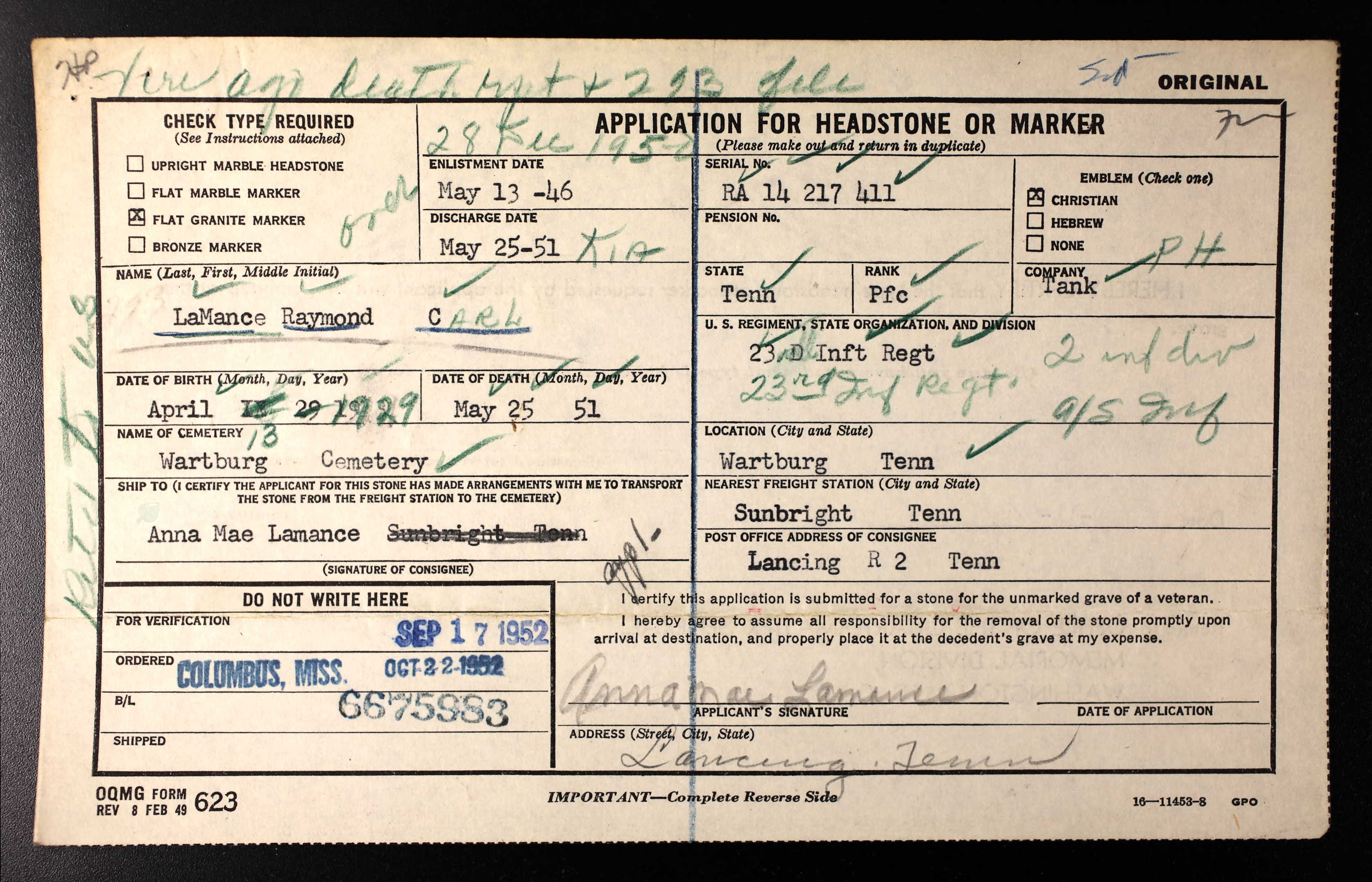 Private First Class Raymond Carl Lamance was a member of the 23rd Infantry Regiment, 2nd Infantry Division. He was Killed in Action while fighting the enemy in South Korea.