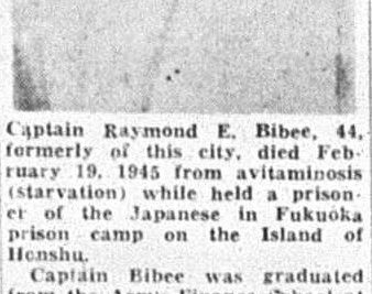 Captain Raymond E. Bibee, 44, formerly of this city, died February 19, 1945 from avitaminosis (Starvation) while held a prisoner of the Japanese in Fukuoka prisonn camp on the Island of Henshu.