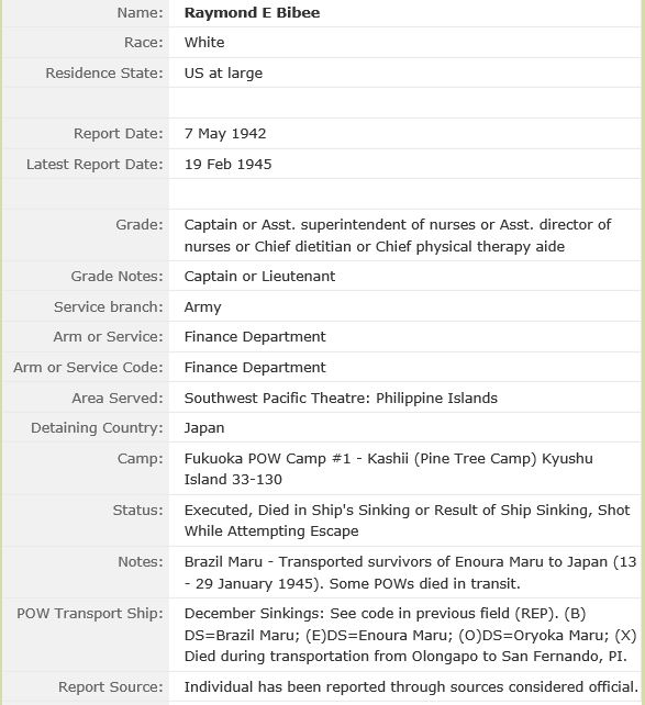 Captain Bibee served with the Finance Department and was captured in the South Pacific Theatre, Philippine Islands, in 1942. He was as Prisoner of War at Fukuoka POW Camp #1 -Kashii (Pine tree camp) Kyushu Island 33-130. He died while being transported on the Brazil Maru, which was one of the ghastly “Hell Ships.” See: http://www.west-point.org/family/japanese-pow/ShipsNum.htm
