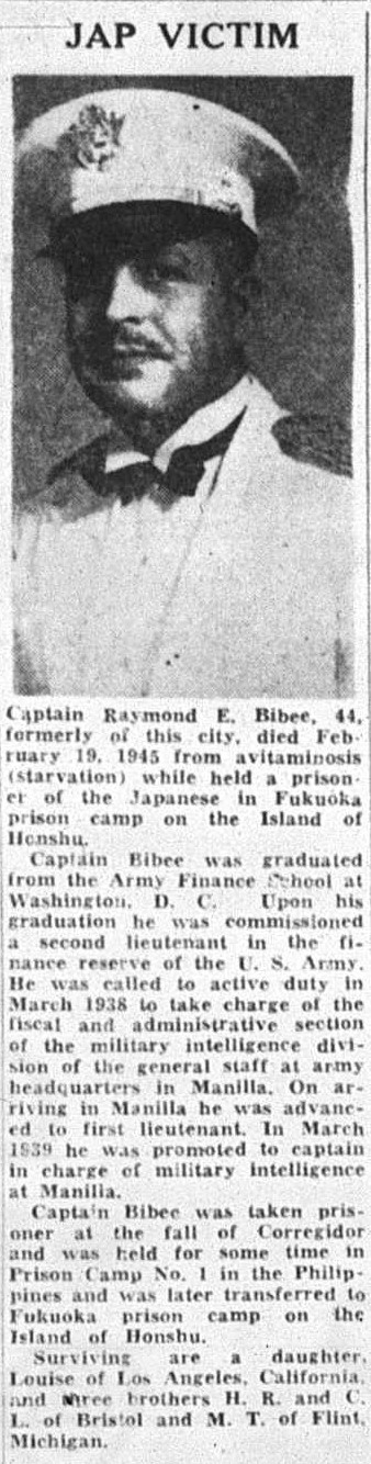 Captain Raymond E. Bibee, 44, formerly of this city, died February 19, 1945 from avitaminosis (Starvation) while held a prisoner of the Japanese in Fukuoka prisonn camp on the Island of Henshu.