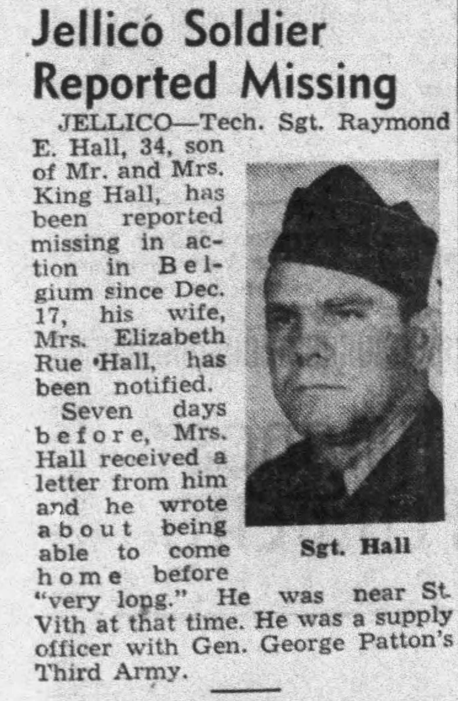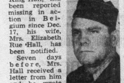 Jellico – Tech. Sgt. Raymond E. Hall, 34, son of Mr. and Mrs. King Hall, has been reported missing in action in Belgium since Dec. 17, 1944, his wife, Mrs. Elizabeth Rue Hall has been notified. Seven days before, Mrs. Hall received a letter from him and he wrote about being able to come home before “ very long”. He was near St. Vith at that time. He was a supply officer with Gen. George Patton’s Third Army.