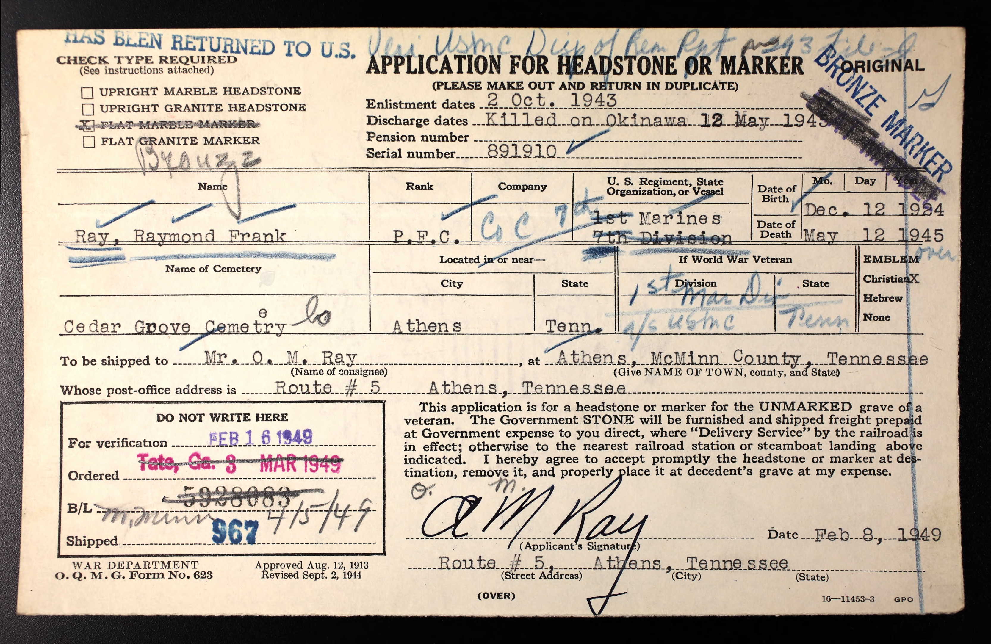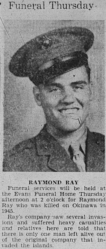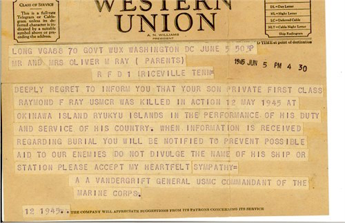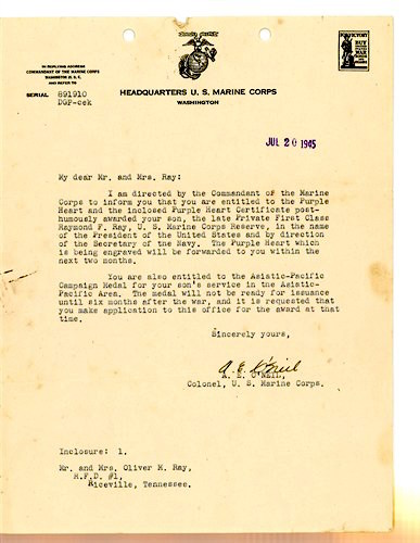 7th Marines, 1th Marine Division, Company C, Machine Gunnerarents: Mr. and Mrs. Oliver M. Ray, Rt 1, Riceville, TN