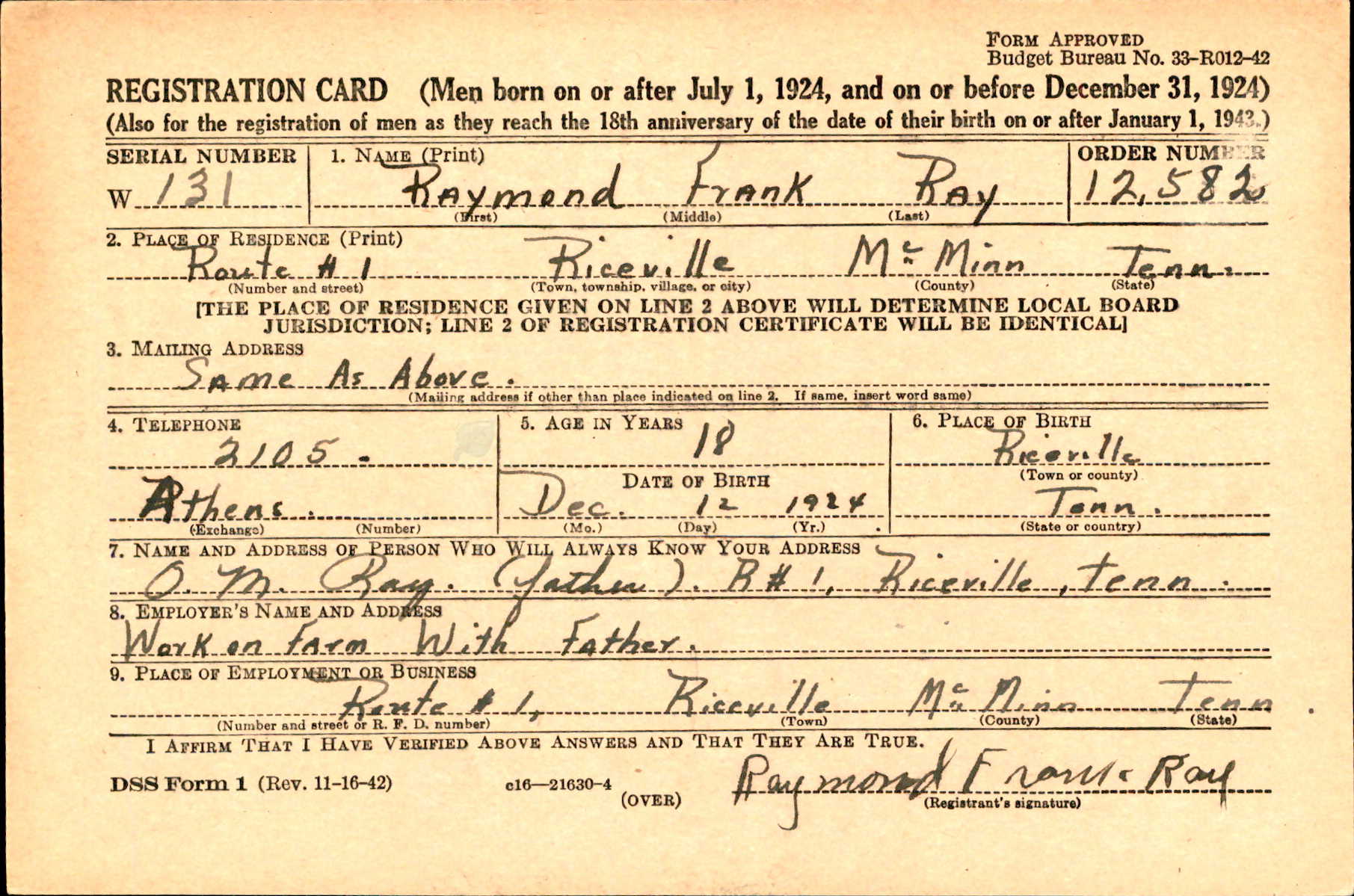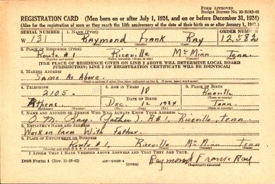 Raymond Frank Ray was born 12 December 1924 in Riceville, Tennessee. He was the son of Oliver “Ollie” MacAaelly Ray and Sarah Lucinda “Lucy” Bayless.