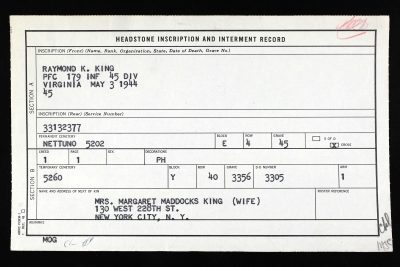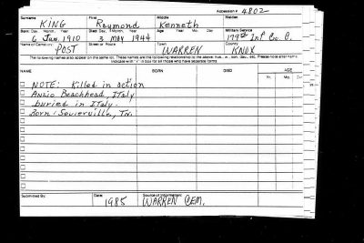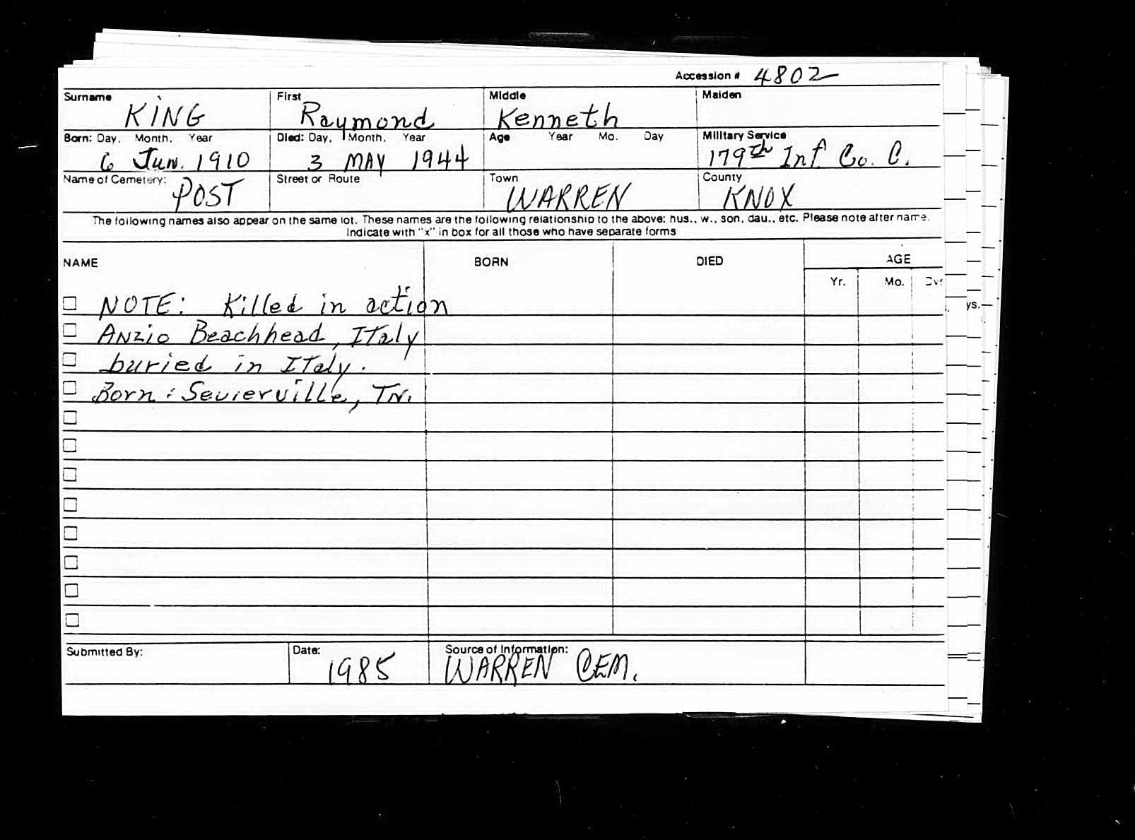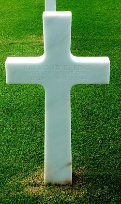 Raymond Kenneth King, born on 6 June 1910 in Sevierville, Sevier County, Tennessee to Charles Henry King and Martha Maria Butler. He was married to Margaret Maddocks King. He enlisted on 11 February 1942 at Camp Lee in Virginia. He was killed on 3 May 1944 on the Anzio Beachhead in Italy and is buried at Sicily-Rome American Cemtery in Nettuno, Città Metropolitana di Roma Capitale, Lazio, Italy.