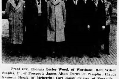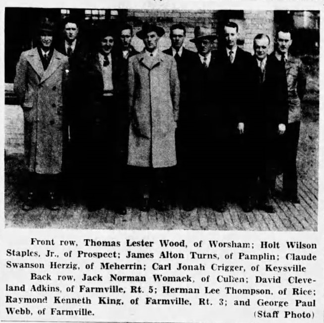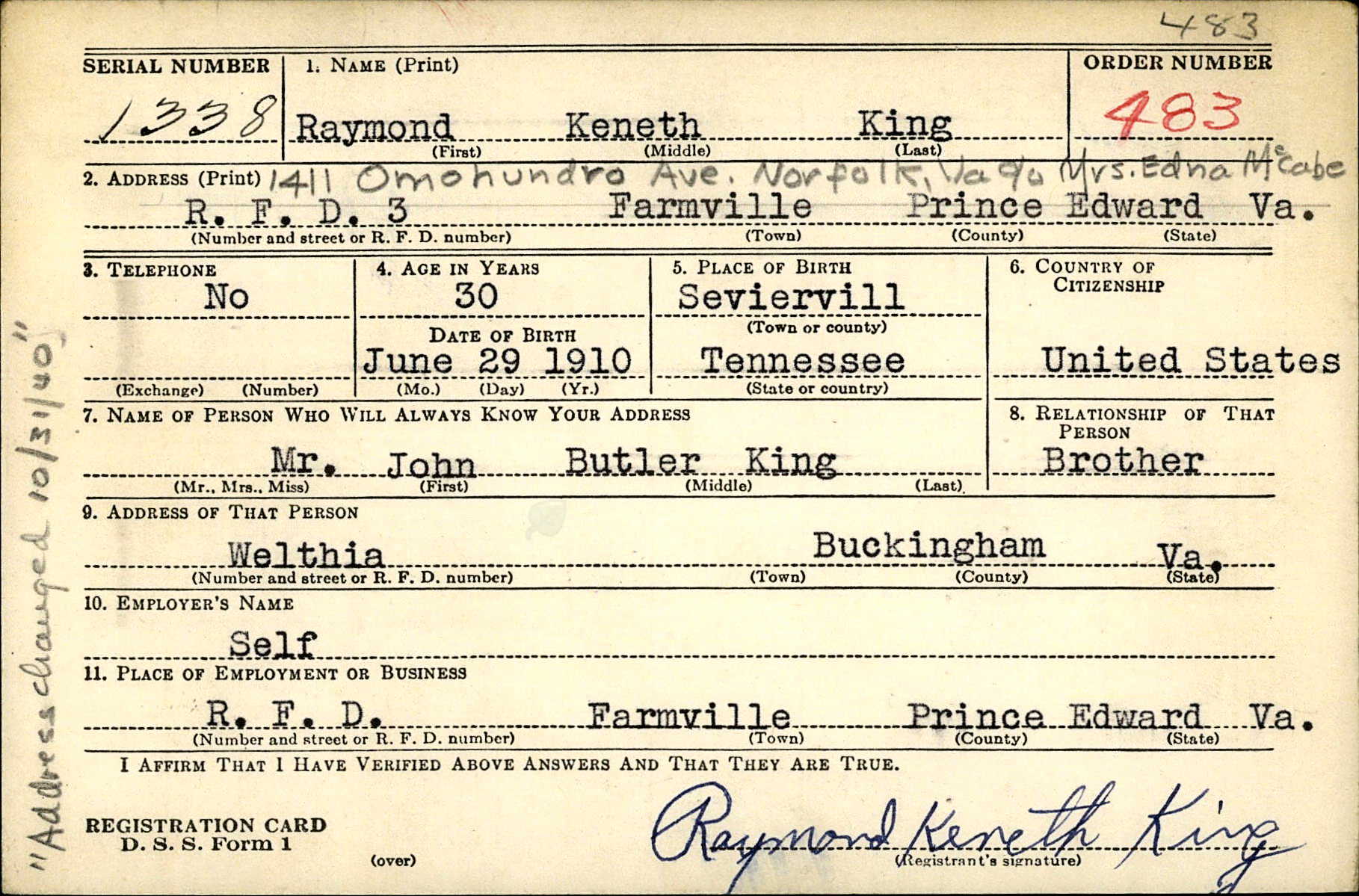 Relatives in Buckingham county have received word that Pfc. Raymond King, aged 34, of Farmville, was killed in action on the Anzio beachhead near Naples, on May 3. He was inducted into the infantry in March 1942 and was sent to Italy in January of this year, having previously been on coast guard duty in Maine. He is survived by his wife, Margarette E., formerly of Damariscotta, Maine; his parents, Mr. and Mrs. C.H. King; one sister, Mrs. Edna Fanche; four brothers, Charles King Jr. Samuel King, Fred King of Sevierville, Tenn., one brother, John King, Wealthea; two aunts, Mrs. Annie Ownsby, Dillwyn and Mrs. Sallie E. Carr, Anthony, Kans. Reared in Tennessee, he came to Virginia in 1936 and spent the remainder of his civilian life farming in Buckingham and Prince Edward counties, where he made a host of friends. He was noted for his courtesy and kindness to every one.