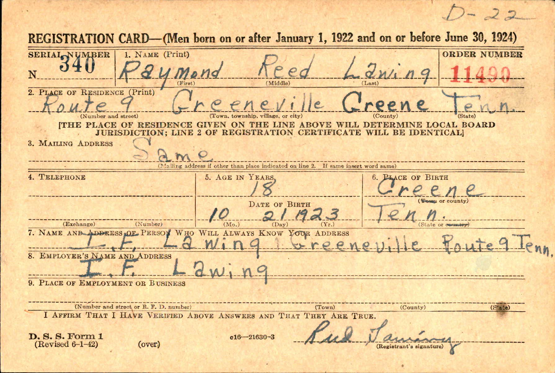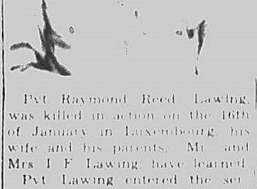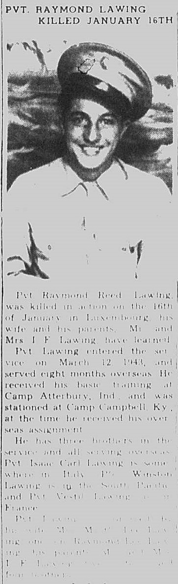 Pvt. Raymond Reed Lawing was killed in action on the 16th of January in Luxembourg his wife and his parents, Mr. and Mrs. I.F. Lawing have learned. Pvt. Lawing entered the service on March 12, 1944 and served eight months overseas. He received his basic training at Camp Atterbury, Ind. And was stationed at Camp Campbell, Ky. At the time he received his overseas assignment. He has three brothers in the service and all serving overseas. Pvt. Isaac Carl Lawing is somewhere in Italy, Pvt. Winston Lawing is in the South Pacific and Pvt. Vestal Lawing is in France.