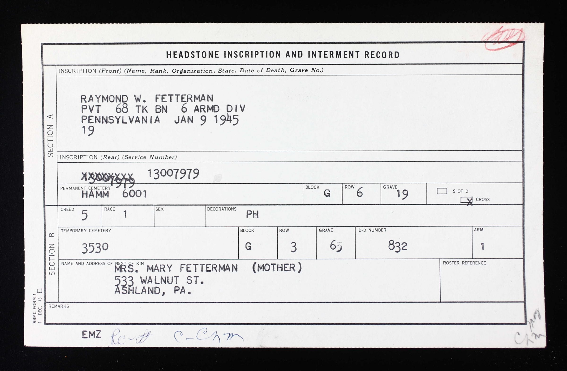 Raymond W. Fetterman was born in 1923 in Pennsylvania to Harry Fetterman and Mary H. Snyder.