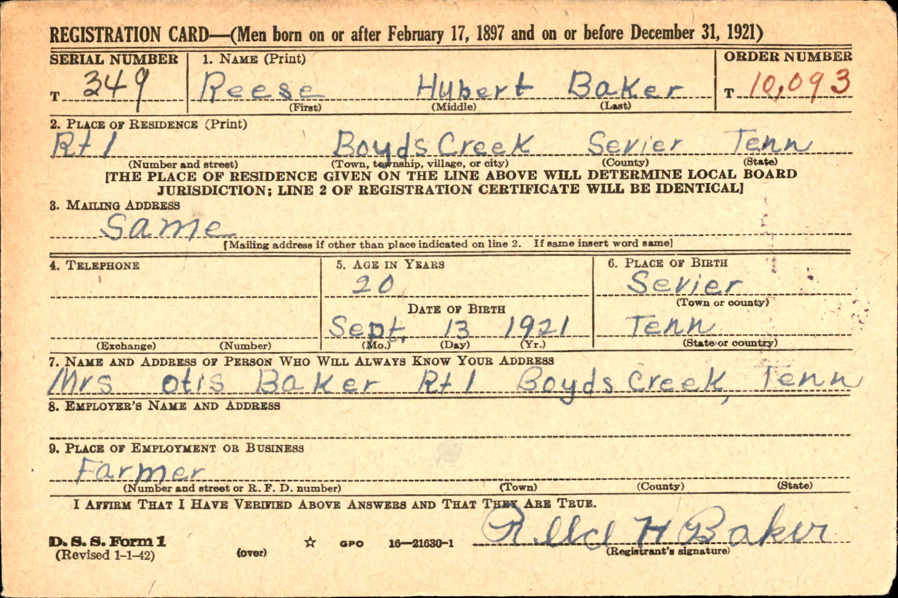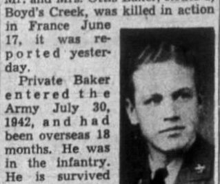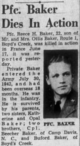 Pfc. Reece H. Baker, 22, son of Mr. and Mrs. Ottis Baker, Route 1, Boyd’s Creek, was killed in action in France, June 17, it was reported yesterday. Private Baker entered the Army July 30, 1942, and had been overseas 18 months. He was in the infantry. He is survived by his parents, two sisters, Katherine and Opal Baker; two brothers, Cpl. Beecher Baker, of Camp Davis, N.C., and Buford Baker, of Boyd’s Creek.