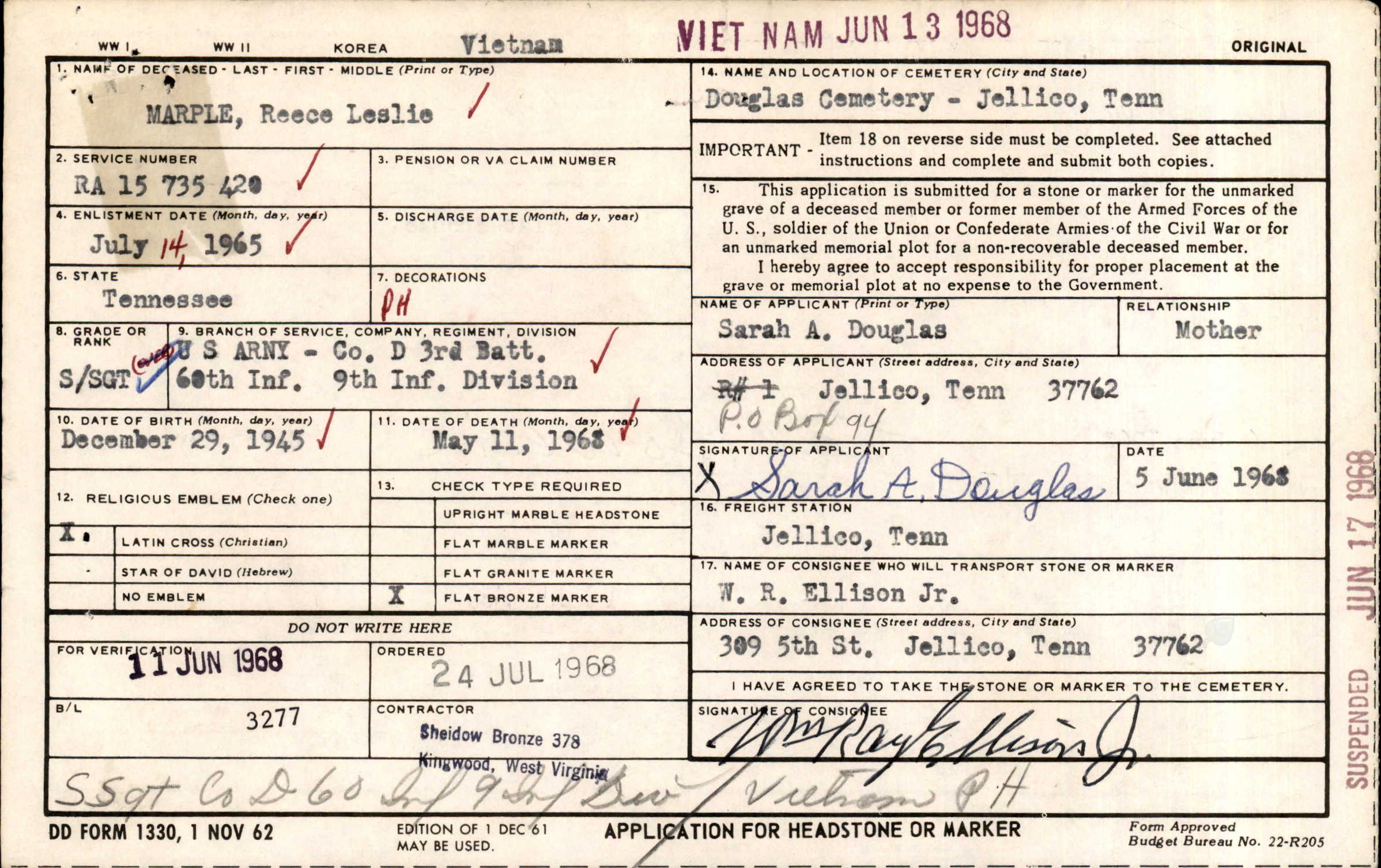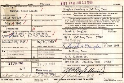 Staff Sergeant Reece Leslie Marple was born on December 29, 1945, and was originally from Jellico, Tennessee. He served his country in the Vietnam War in the United States Army, as an infantryman in B Company, 3rd Battalion, 60th Infantry, 9th Infantry Division. He was a 2-year veteran of the Army when his tour began on June 26, 1967. SSgt. Marple had been in Vietnam for nearly a year when he was killed under hostile conditions on May 11, 1968, in Long An province, South Vietnam; he was 22 years old at the time of his death. SSgt. Marple was the recipient of the Purple Heart award. He is buried at Douglas Cemetery in Oswego, Campbell County, Tennessee, and is memorialized on the Vietnam Veterans Memorial on Panel 58E, Line 23.