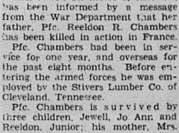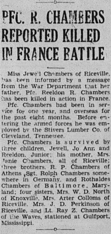 Miss Jewell Chambers of Riceville has been informed by a message from the War Department that her father, Pfc. Reeldon R. Chambers has been killed in action in France. Pfc. Chambers had been in service for one year, and overseas for the past eight months. Before entering the armed forces he was employed by the Stivers Lumber Co. Of Cleveland, Tennessee.