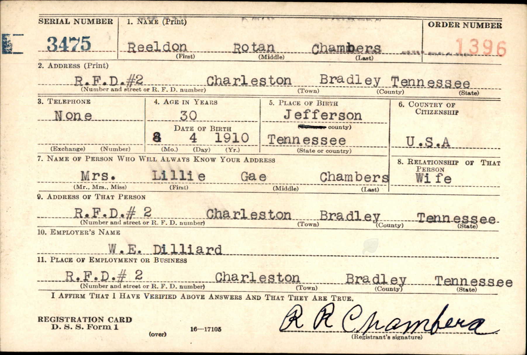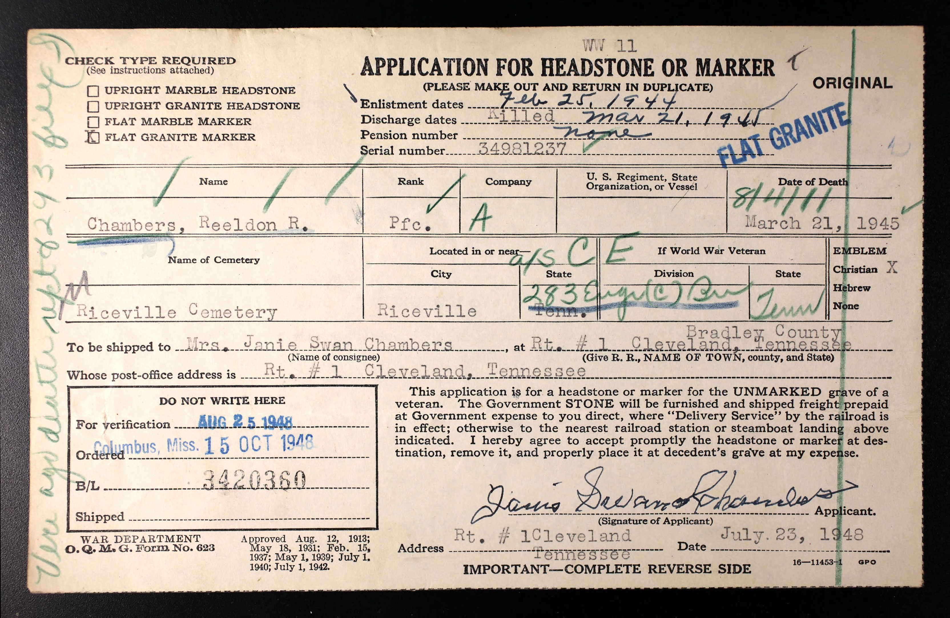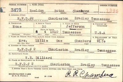 Pfc. Chambers is survived by three children, Jewell, Jo Ann and Reeldon Jr.; his mothers, Mrs. Janie Chambers, all of Riceville; three brothers, R.P. Chambers of Athens, Sgt Rolph Chambers somewhere in Germany and Rothaldes Chambers of Baltimore, Maryland; four sisters, Mrs. W.D. Norht of Knoxville, Mrs. Arter Colloms of Riceville, Mrs. J.D Perkinson of Riceville and Lt Ray Z. Chambers of the Waves, stationed at Gulfport, Mississippi.