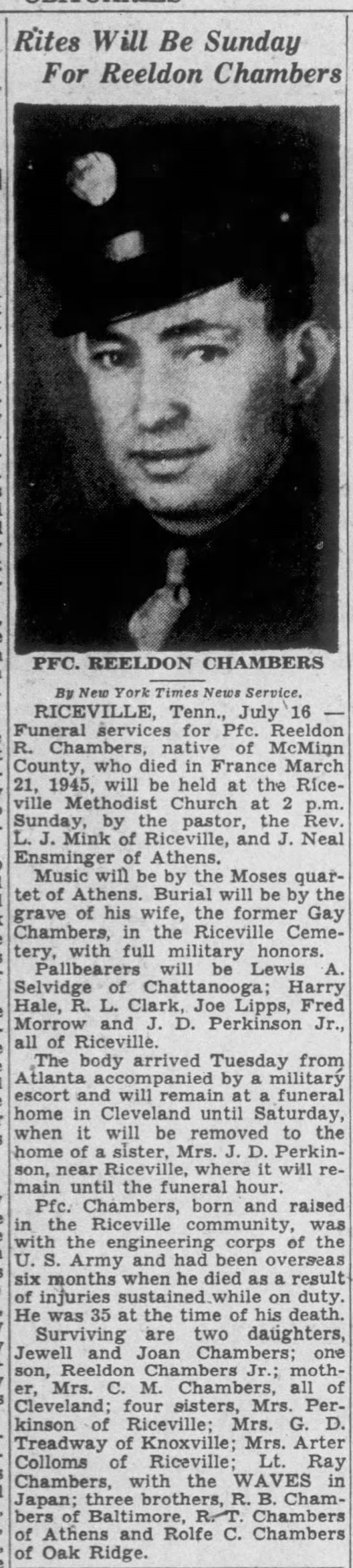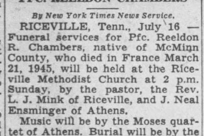 Funeral services for Pfc. Reeldon R. Chambers, native of McMinn County, who died in France March 21, 1945, will be held at the RIceville Methodist Church. The body arrived Tuesday from Atlanta accompanied by a military escort and will remain at a funeral home in Cleveland until Saturday, when it will be removed to the home of a sister, Mrs. J.D. Perkinson, near Riceville, where it will remain until the funeral hour. Pfc. Chambers, born and raised in the Riceville community, was with the engineering corps of the U.S. Army and had been overseas six months when he died as a result of injuries sustained while on duty. He was 35 at the time of his death. Surviving are two daughters, Jewell and Joan Chambers; one son, Reeldon Chambers Jr.; mother, Mrs. C.M. Chambers, all of Cleveland; four sisters, Mrs. Perkinson of Riceville; Mrs. G.D. Treadway of Knoxville; Mrs. Arter Colloms of Riceville; Lt. Ray Chambers, with the WAVES in Japan; three brothers, R.B. Chambers of Baltimore, R.T. Chambers of Athens and Rolfe C. Chambers of Oak Ridge.