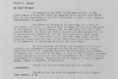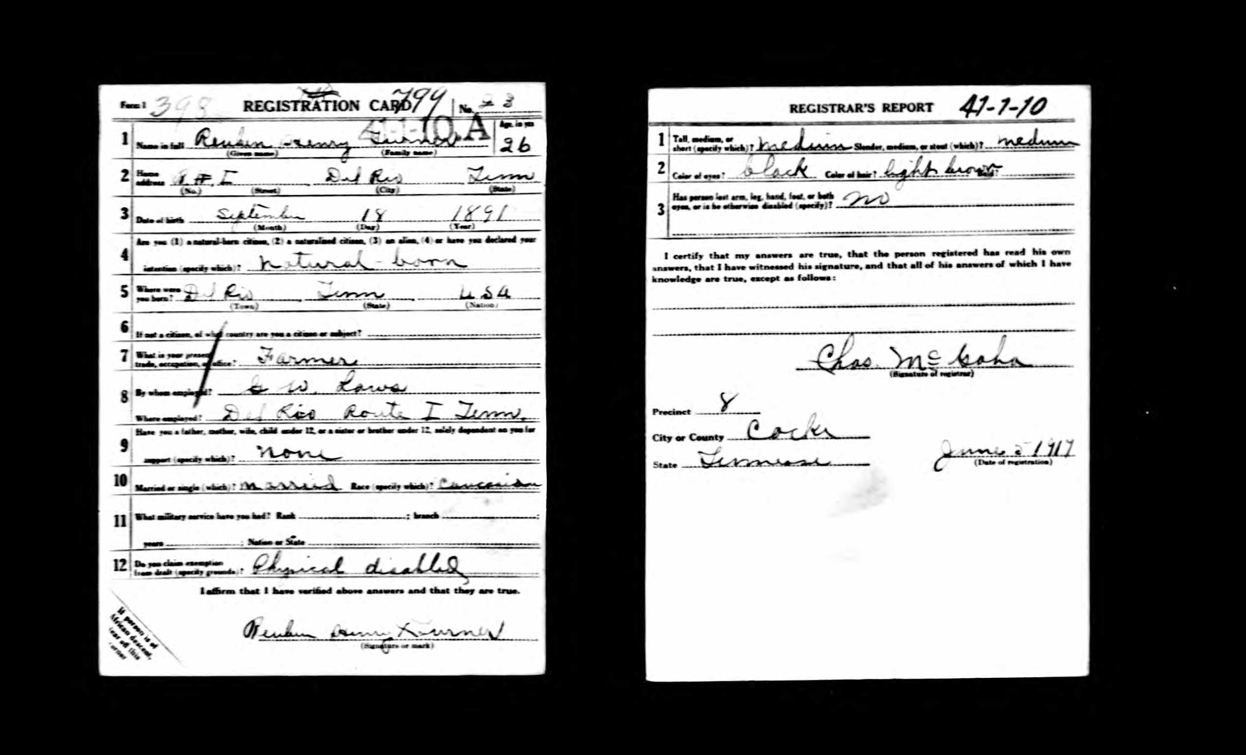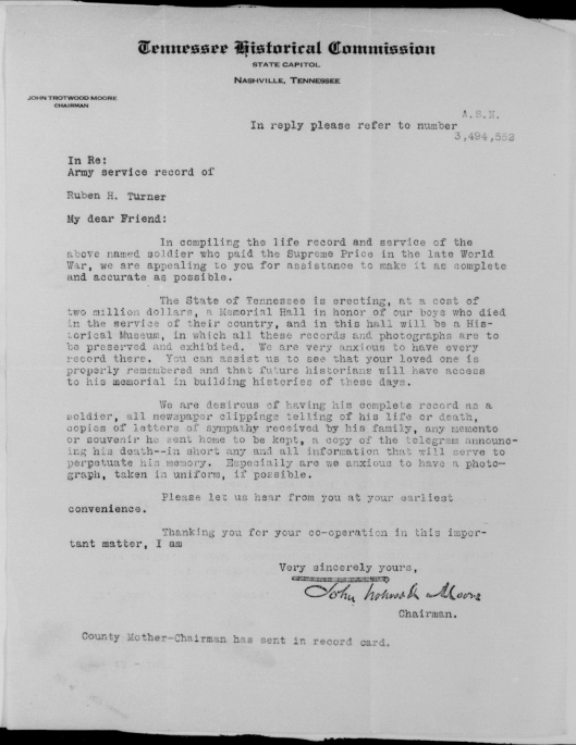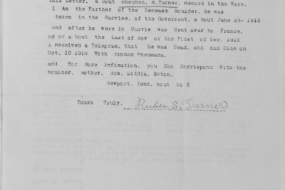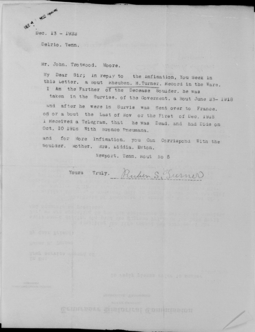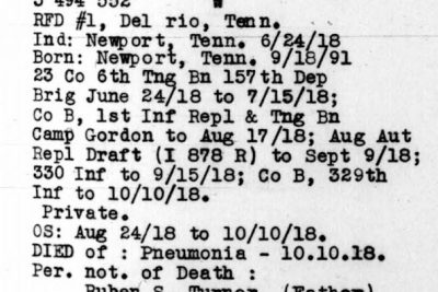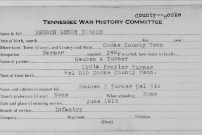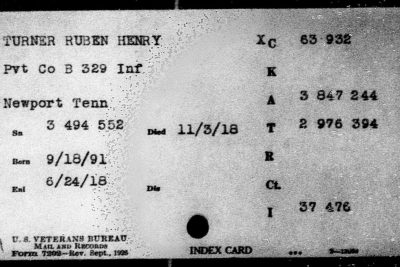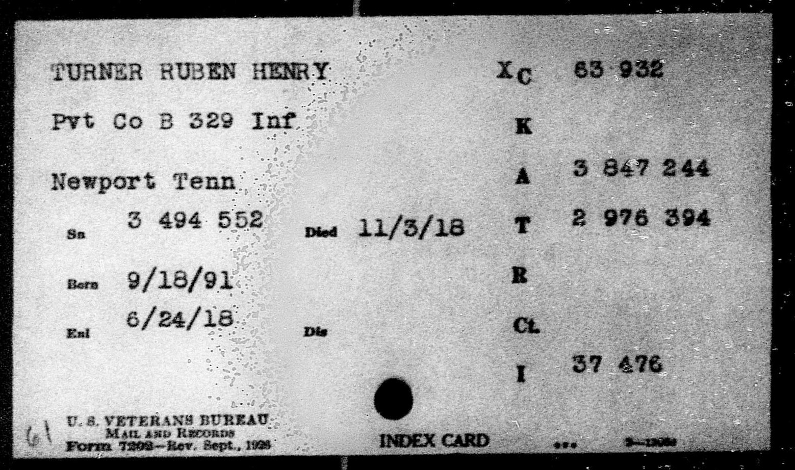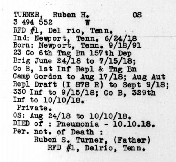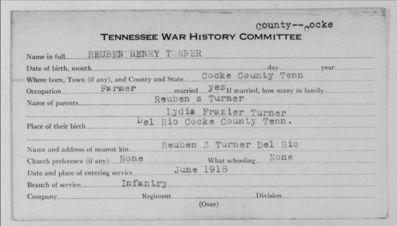 Reuben (also spelled as Ruben) Henry Turner was born in 1891 in Newport, Tennessee to Reuben S. Turner and Lydia Frazier. He entered the service in June, 1918 and died of Pneumonia on October 10, 1918 in France.
