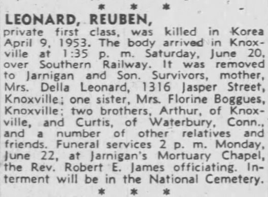 Reuben (also spelled as Reubin) Leonard was born December 17, 1926. He was the son of Della Leonard of 1316 Jasper Street. He had one sister Florine Boggues of Knoxville and two brothers, Arthur Leonard of Knoxville and Curtis Leonard of Waterbury, Connecticut.