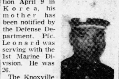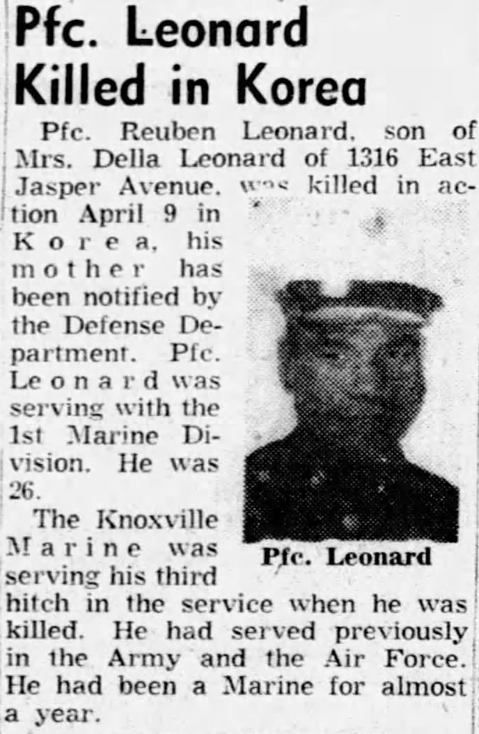 Pfc. Reuben Leonard, son of Mrs. Della Leonard of 1316 East Jasper Avenue, was killed in action April 9 in Korea, his mother has been notified by the Defense Department. Pfc. Leonard was serving with the 1st Marine Division. He was 26. The Knoxville Marine was serving his third hitch in the service when he was killed. He had served previously in the Army and the Air Force. He had been a Marine for almost a year.