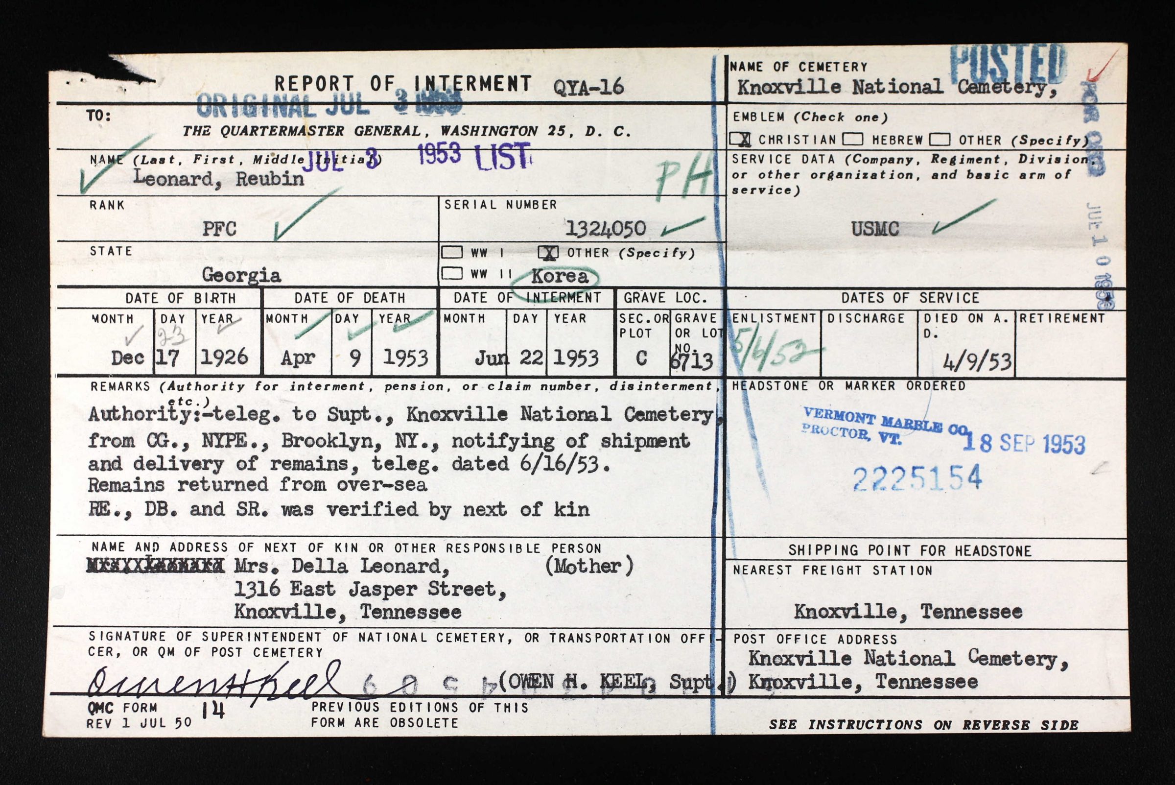 Private First Class Leonard joined the United States Marines on May 6, 1952, at the age of twenty five. He was a member of Company D, 2nd Battalion, 7th Marines, 1st Marine Division. He was killed in action in the final months of the war while fighting the enemy in the Western Outposts of Korea on April 9, 1953.