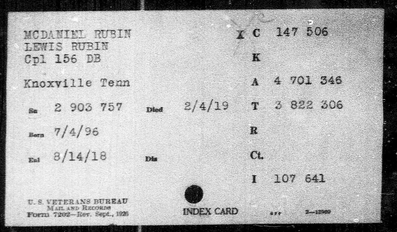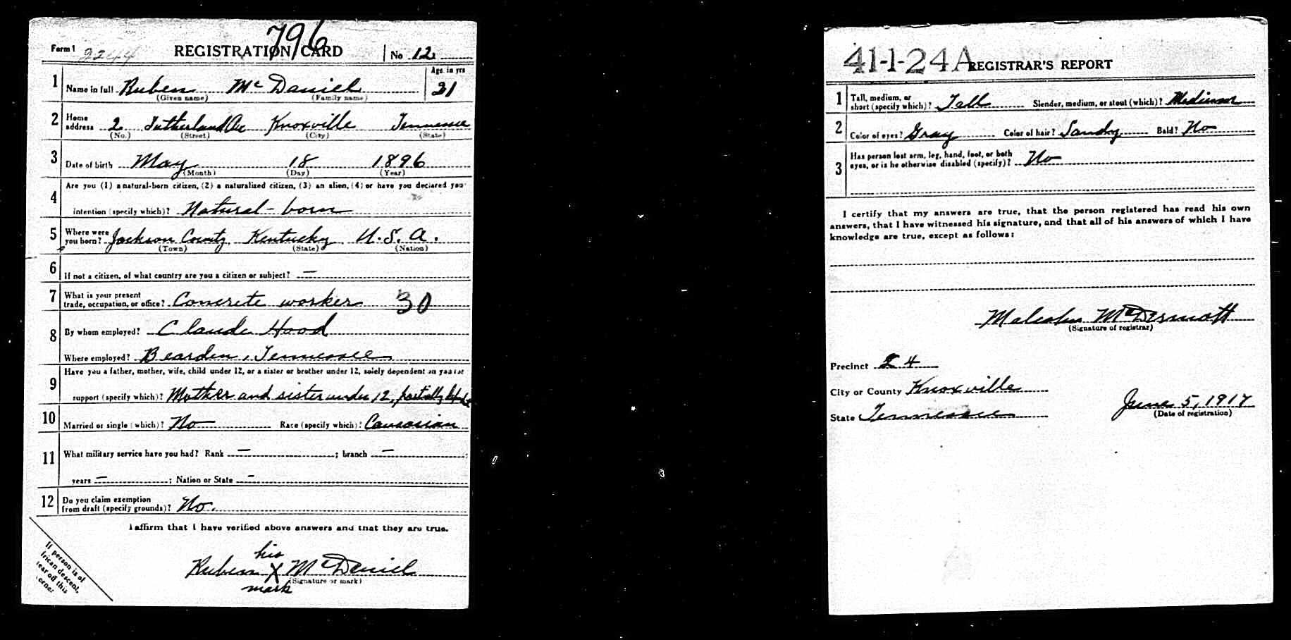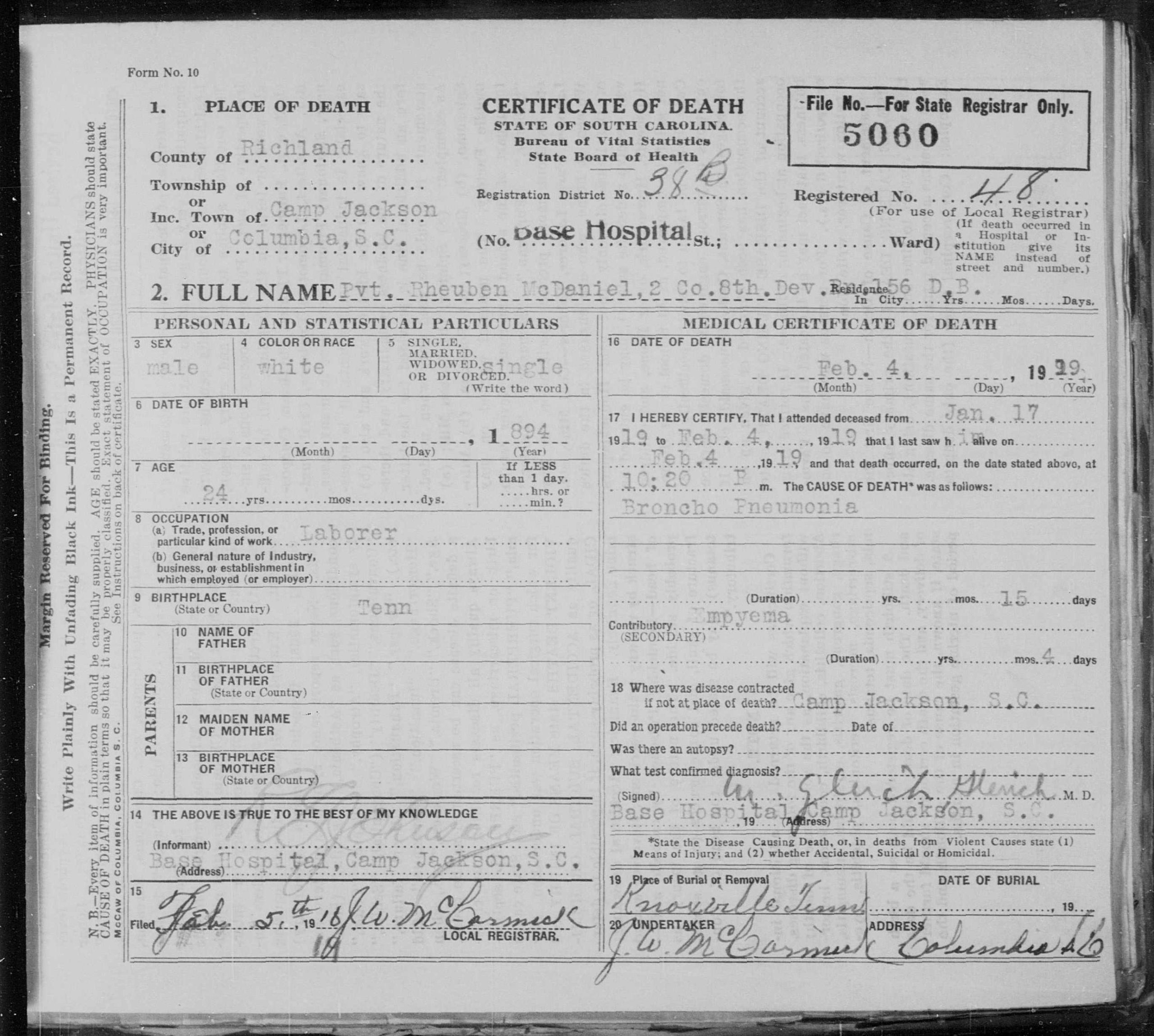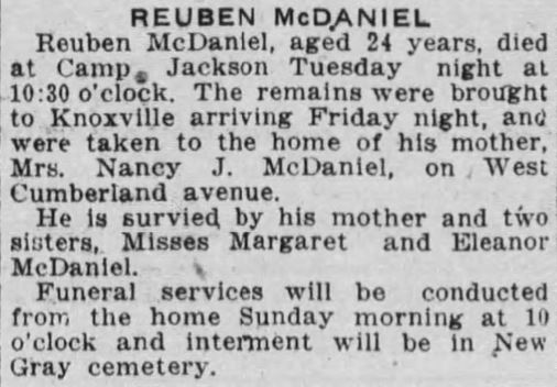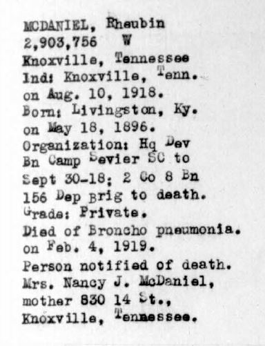 Reuben (also Rubin or Rheubin) Lewis McDaniel was born in 1896 in Livingston, Kentucky. He was a concrete worker for Claude Hood in Bearden, Knoxville, Tennessee, prior to the war. He died of broncho pneumonia on 4 February 1919 at the Base Hospital at Camp Jackson in Columbia, South Carolina.