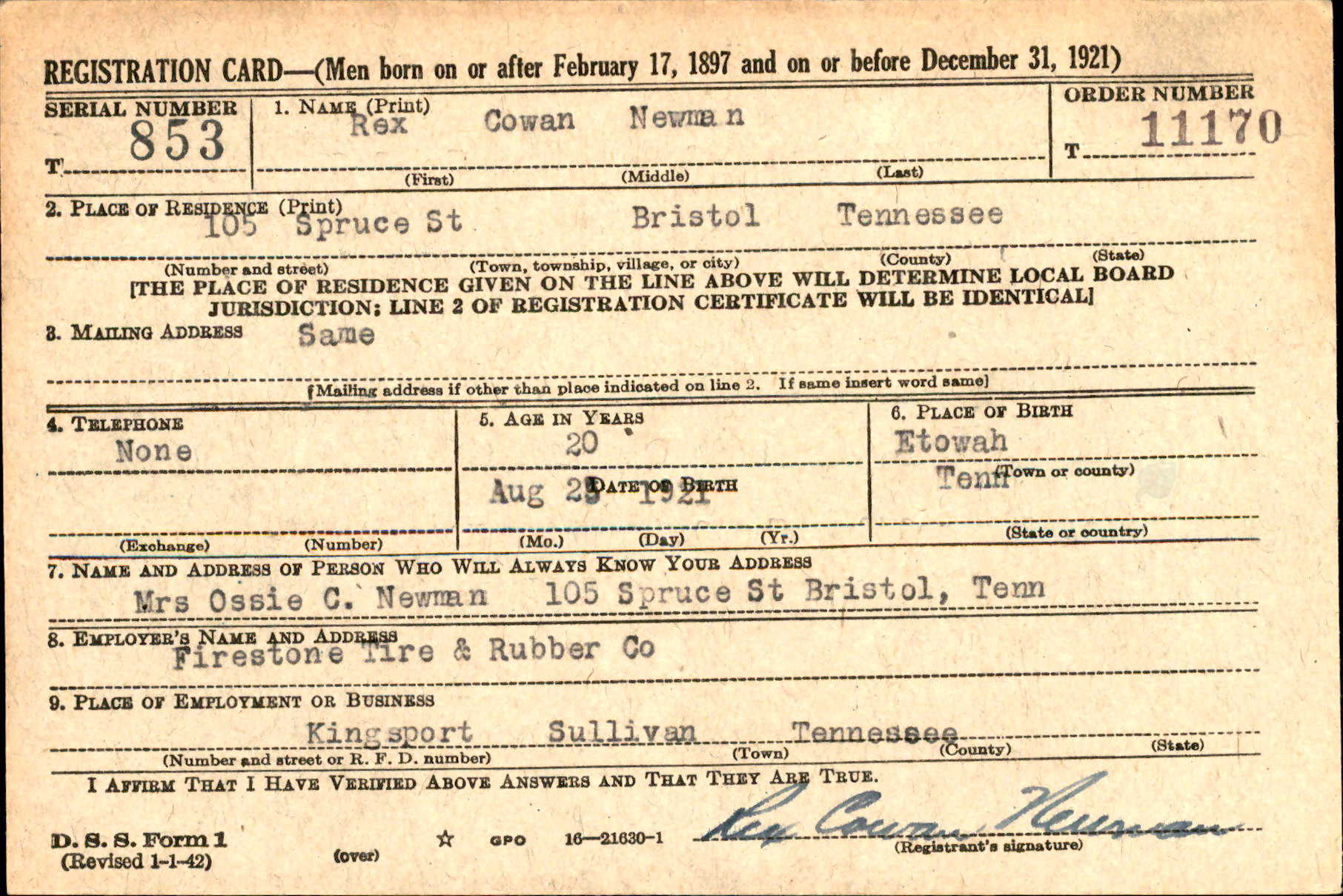 His next of kin was listed as his mother, Mrs. Ossie Cowan Newman, 105 Spruce Street, Bristol, Tenn.