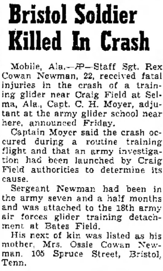 Mobile, Ala. – Staff Sgt. Rex Cowan Newman, 22, received fatal injuries in the crash of a training glider near Craig Field at Selma, Ala., Capt. C.H. Moyer, adjutant at the army glider school near here, announced Friday.