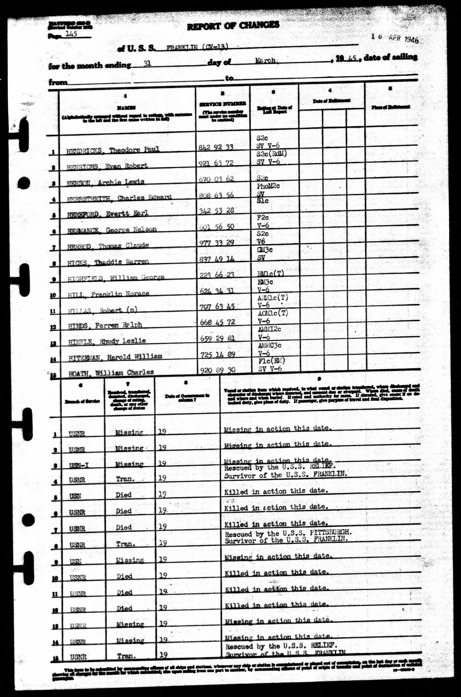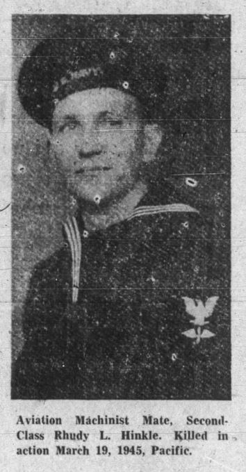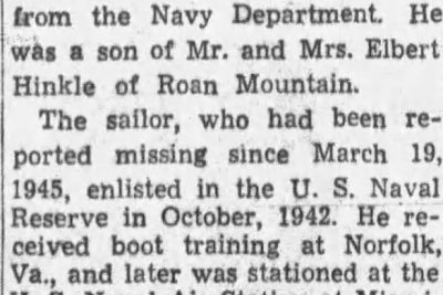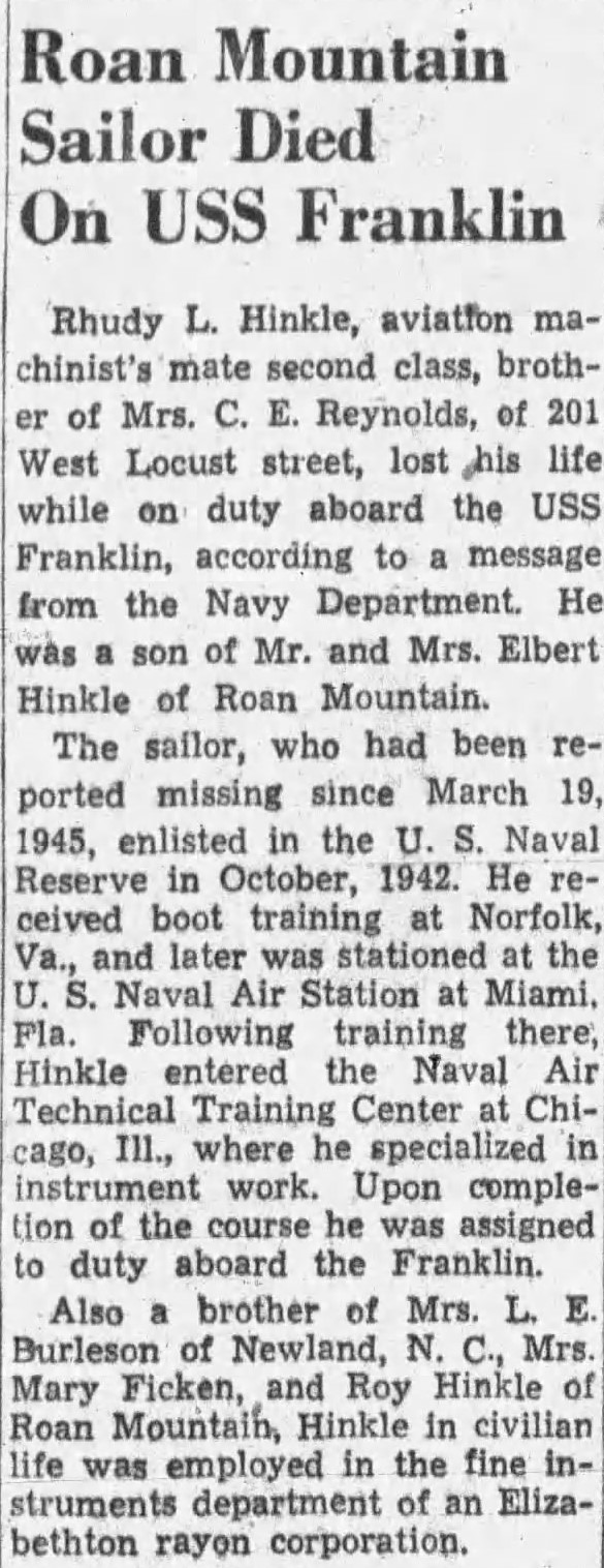 Rhudy L. Hinkle, aviation machinist’s mate second class, brother of Mrs. C.E. Reynolds, of 201 West Locust street, lost his life while on duty aboard the USS Franklin, according to a message from the Navy Department. He was a son of Mr. and Mrs. Elbert Hinkle of Roan Mountain. The sailor, who had been reported missing since March 19, 1945, enlisted in the U.S. Naval Reserve in October, 1942. He received boot training at Norfolk, Va., and later was stationed at the U.S. Naval Air Station at Miami, Fla. Following training there, Hinkle entered the Naval Air Technical Training Center at Chicago, Ill., where he specialized in instrument work. Upon completion of the course he was assigned to duty aboard the Franklin.