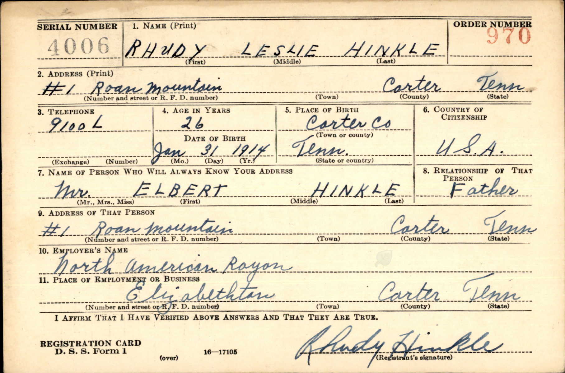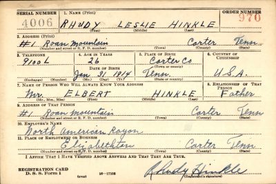 Also a brother of Mrs. L.E. Burleson of Newland, N.C., Mrs. Mary Ficken, and Roy Hinkle of Roan Mountain, Hinkle in civilian life was employed in the fine instruments department of an Elizabethton rayon corporation.