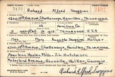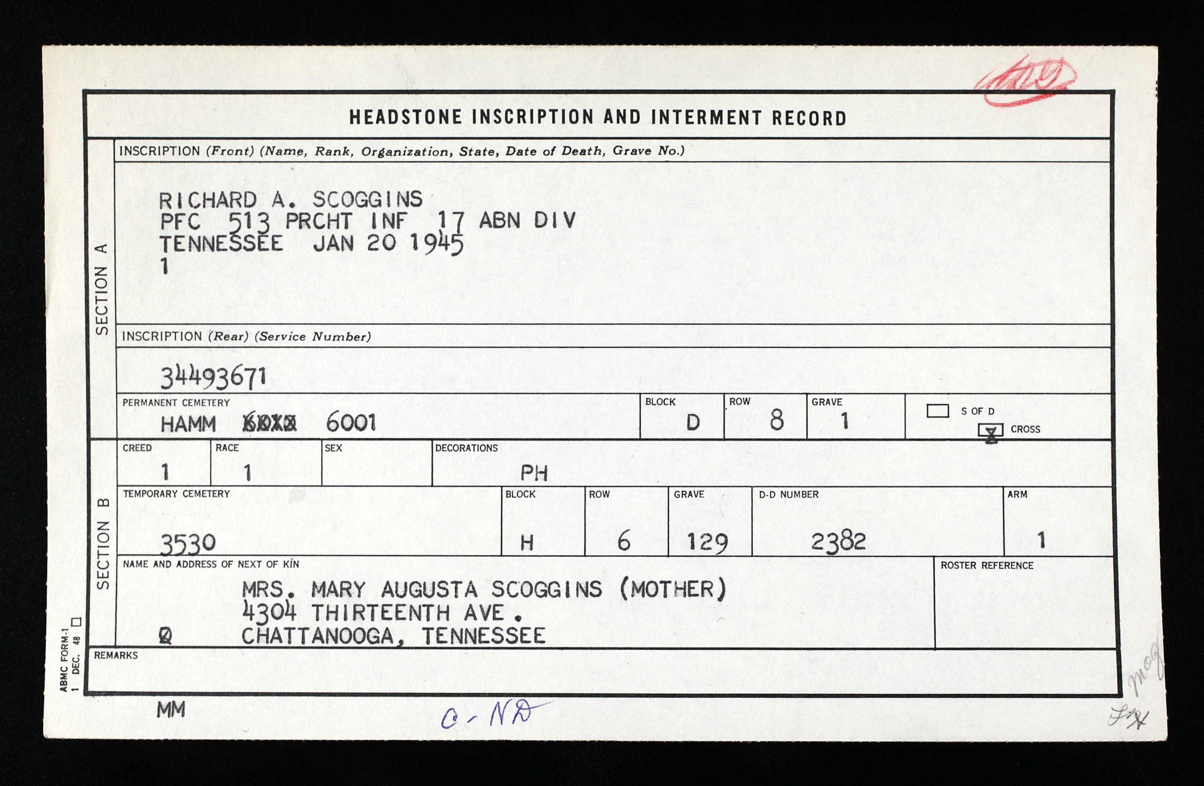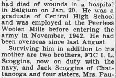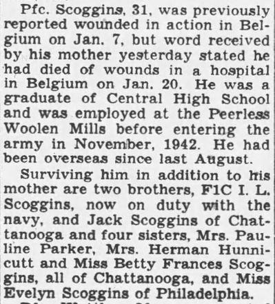 Pfc. Scoggins, 31, was previously reported wounded in action in Belgium on Jan. 7, but word received by his mother yesterday stated he had died of wounds in a hospital in Belgium on Jan. 20. He was a graduate of Central High School and was employed at the Peerless Woolen Mills before entering the army in November, 1942. He had been overseas since last August. Surviving him in addition to his mother are two brothers, F1C I.L. Scoggins, now on duty with the navy, and Jack Scoggins of Chattanooga and four sisters, Mrs. Pauline Parker, Mrs. Herman Hunnicutt and Miss Betty Frances Scoggins, all of Chattanooga and Miss Evelyn Scoggins of Philadelphia.