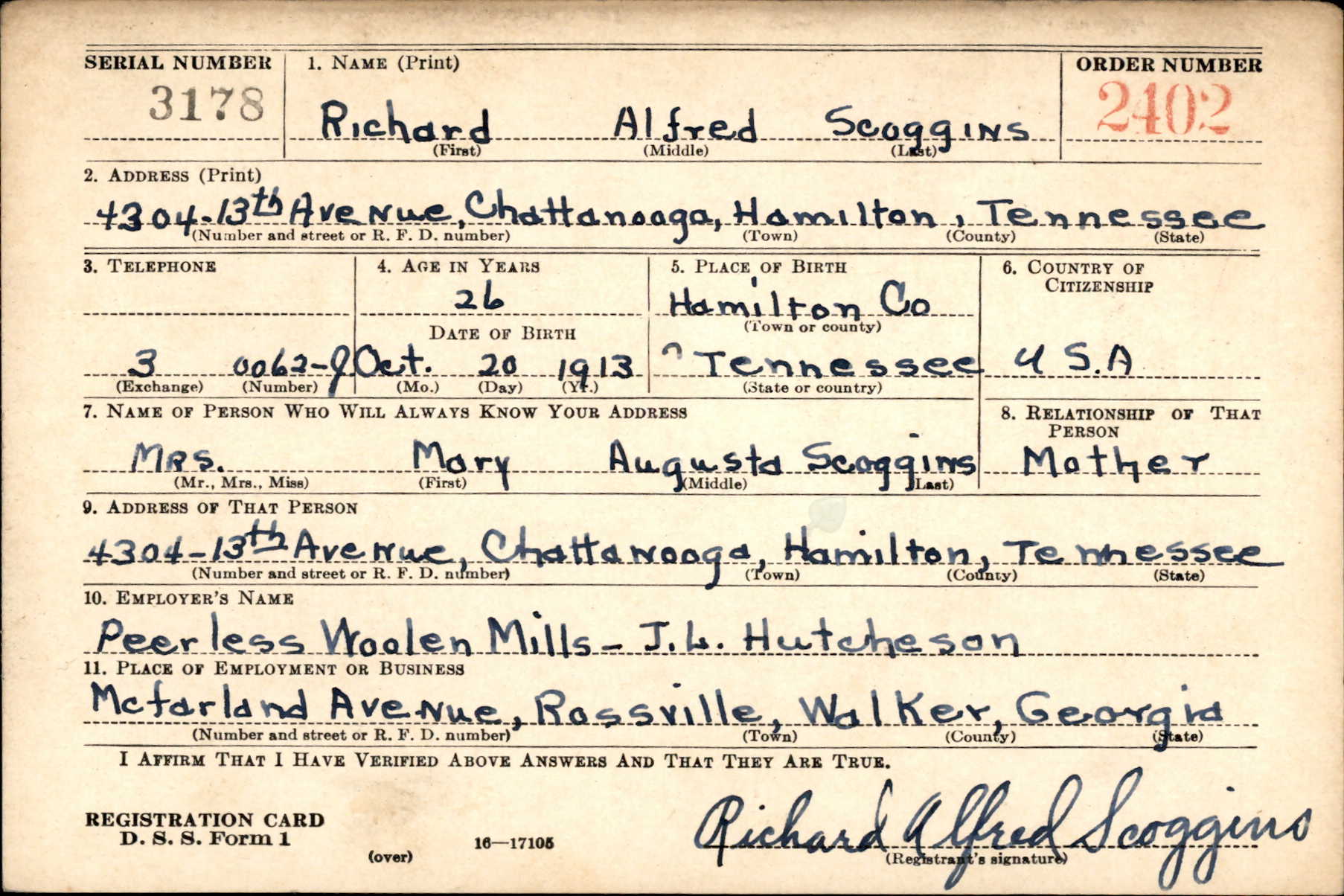 Richard Alfred Scoggins was born in Chattanooga, Tennessee, the son of Ira G. Scoggins and Mary Augusta Murray.