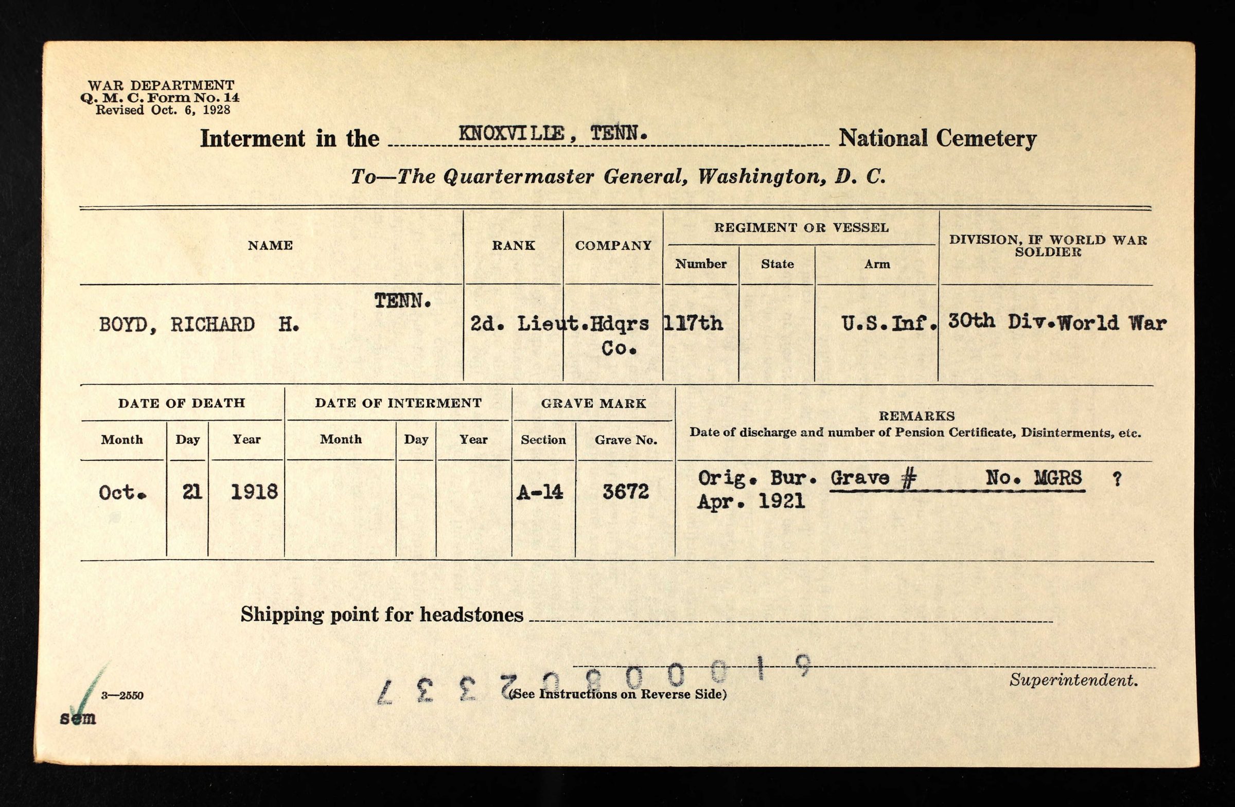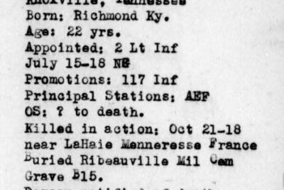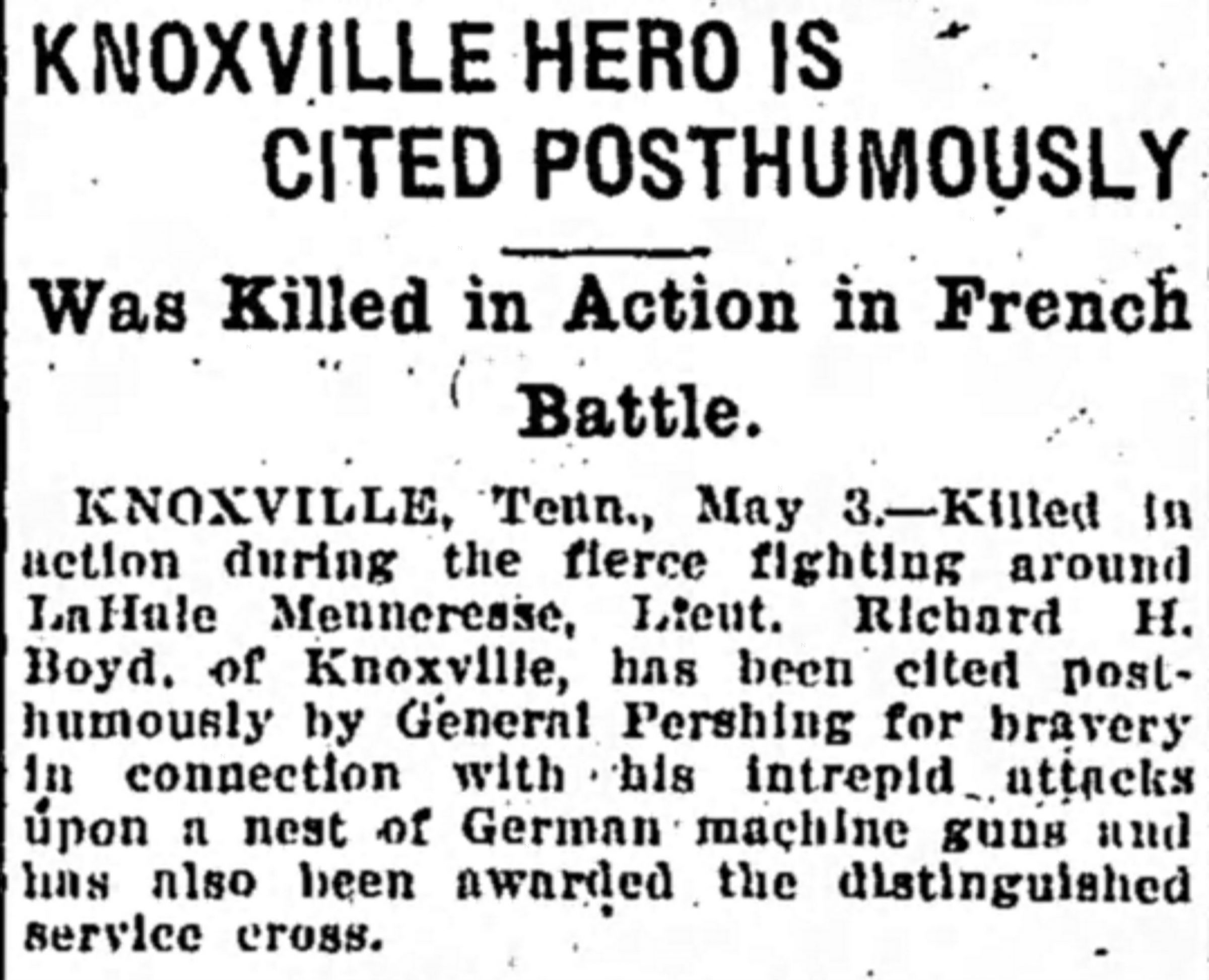 Richard Boyd enlisted in Company E, Second Tennessee Infantry, in July 1917. Transferred to Headquarters Company, 59th Infantry Brigade, at Camp Sevier, SC. Received appointment to attend Third Officers’ Training Camp at Leon Springs, TX, from which he was commissioned second lieutenant in the spring of 1918. On his return he was assigned to the Headquarters Company, 117th Infantry, with which he went overseas. Participated in the Ypres Offensive and all battles of Somme offensive until he was killed in action on October 21, 1918. Awarded the Distinguished Service Cross posthumously (see below).