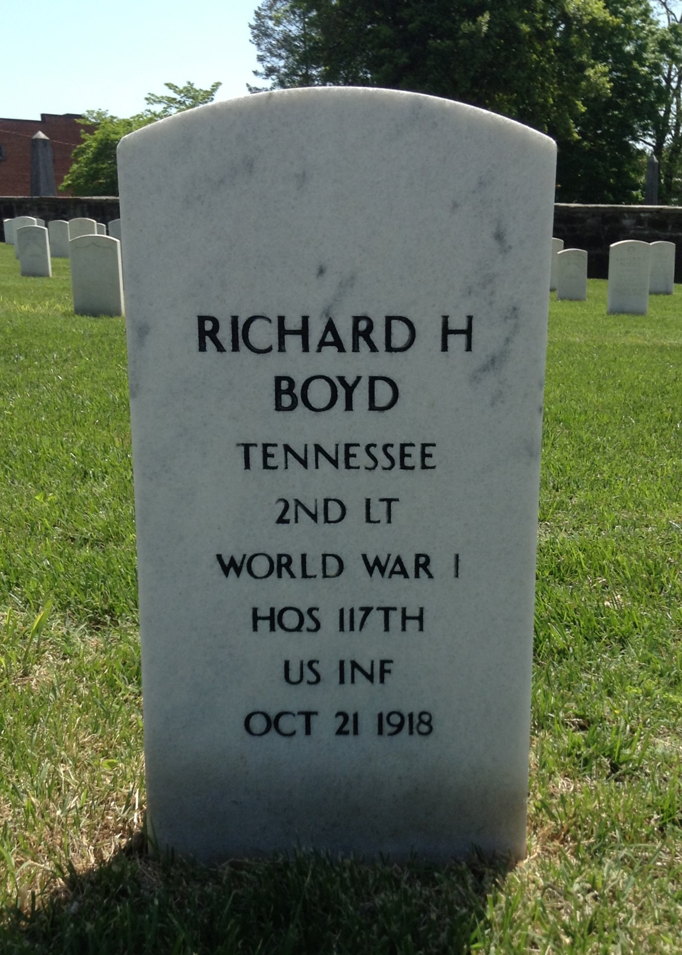 The President of the United States of America, authorized by Act of Congress, July 9, 1918, takes pride in presenting the Distinguished Service Cross Posthumously to Second Lieutenant Infantry Richard H. Boyd, United States Army, for extraordinary heroism in action while serving with 117th Infantry Regiment, 30th Division, A.E.F., near La Haie Menneresse, France, 17 October 1918. After his platoon had suffered severe casualties, and his ammunition entirely exhausted, Lieutenant Boyd went about the town under annihilating fire to collect the stragglers. With a few he managed to collect, he attacked and put out of action three enemy machine-gun nests, after which he reported to the front line. Here he voluntarily exposed himself in assisting wounded from the face of murderous fire, and while standing in full view of the enemy, directing his men to seek shelter, he was killed by a shell explosion. War Department, General Orders 64 1919