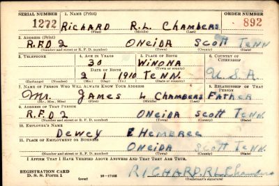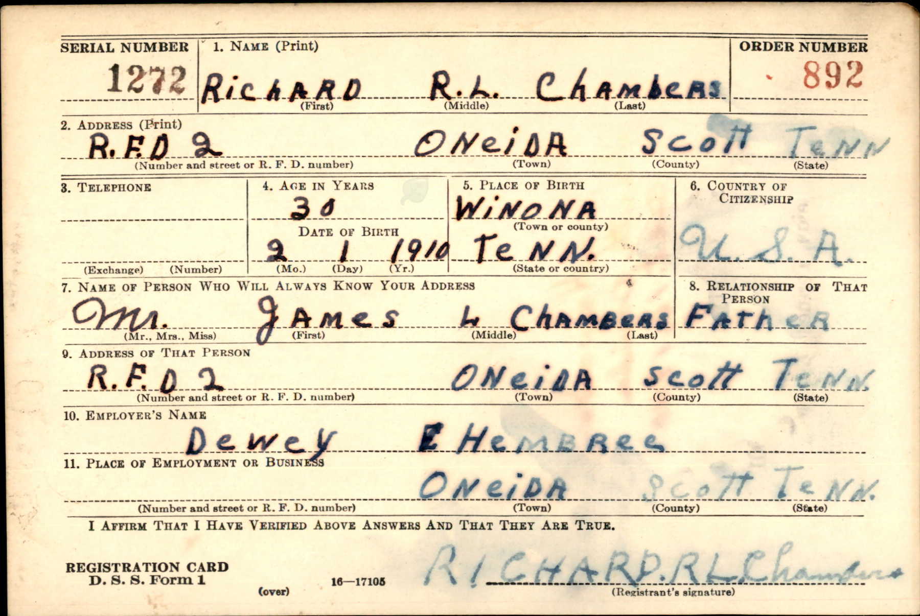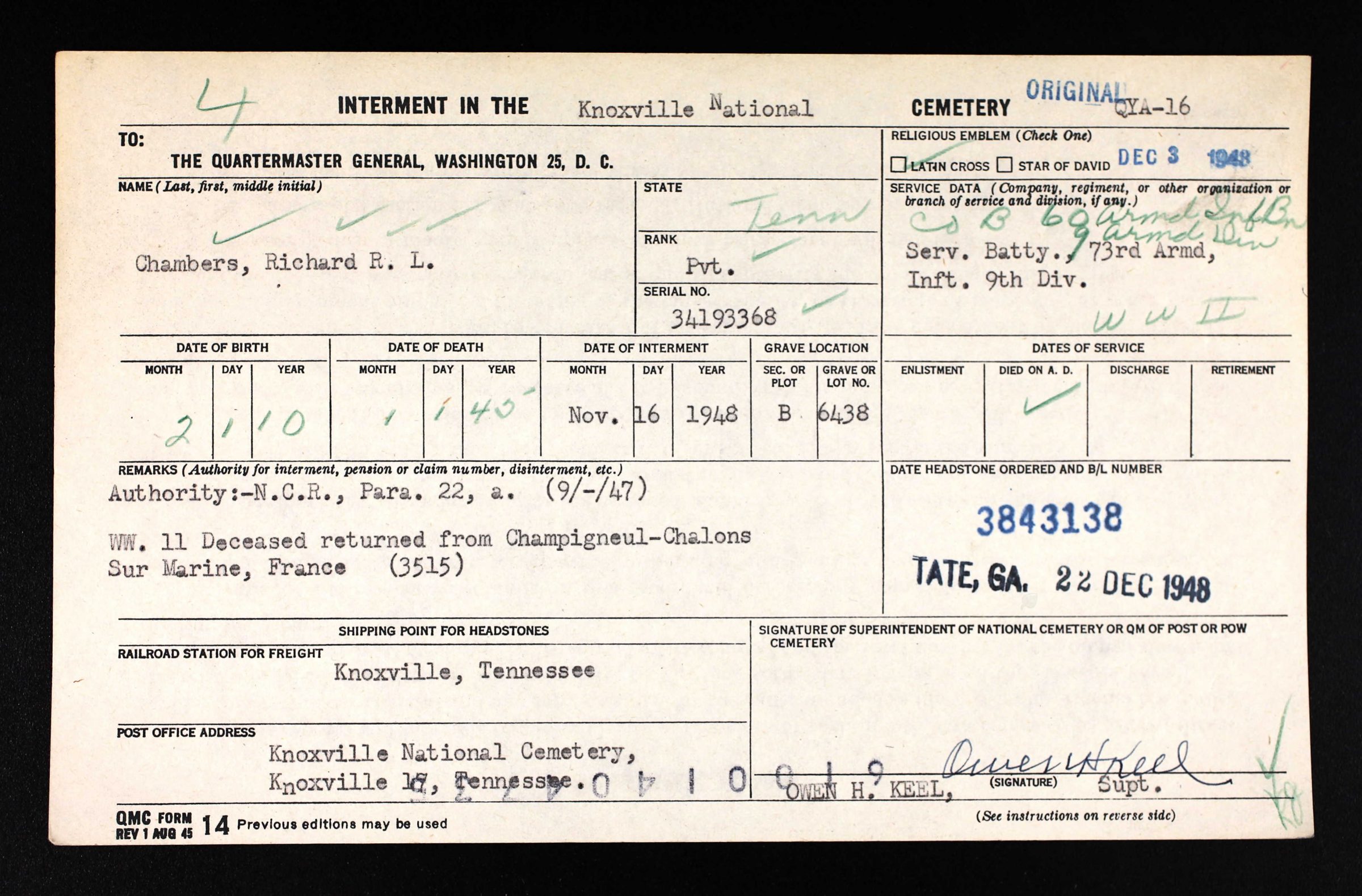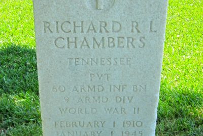 Richard R.L. Chambers was born on 1 February 1910 to James Ledford Chambers and Minnesota “Minnie” Sexton. His brother Private Vernon Chambers served in Northern Italy with a medical detachment of the 361st Regiment, 91st Division.