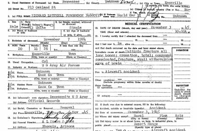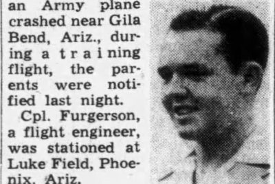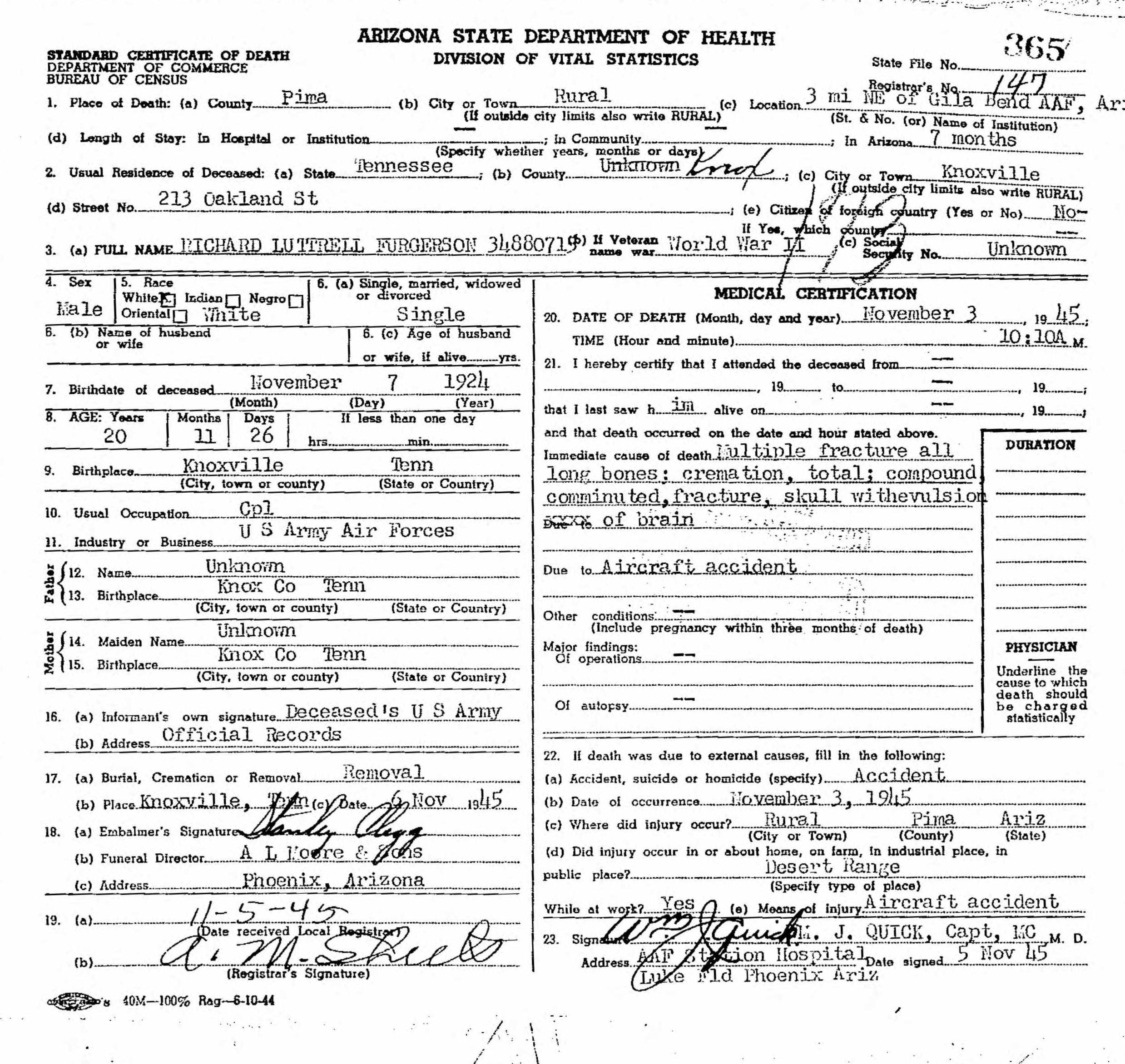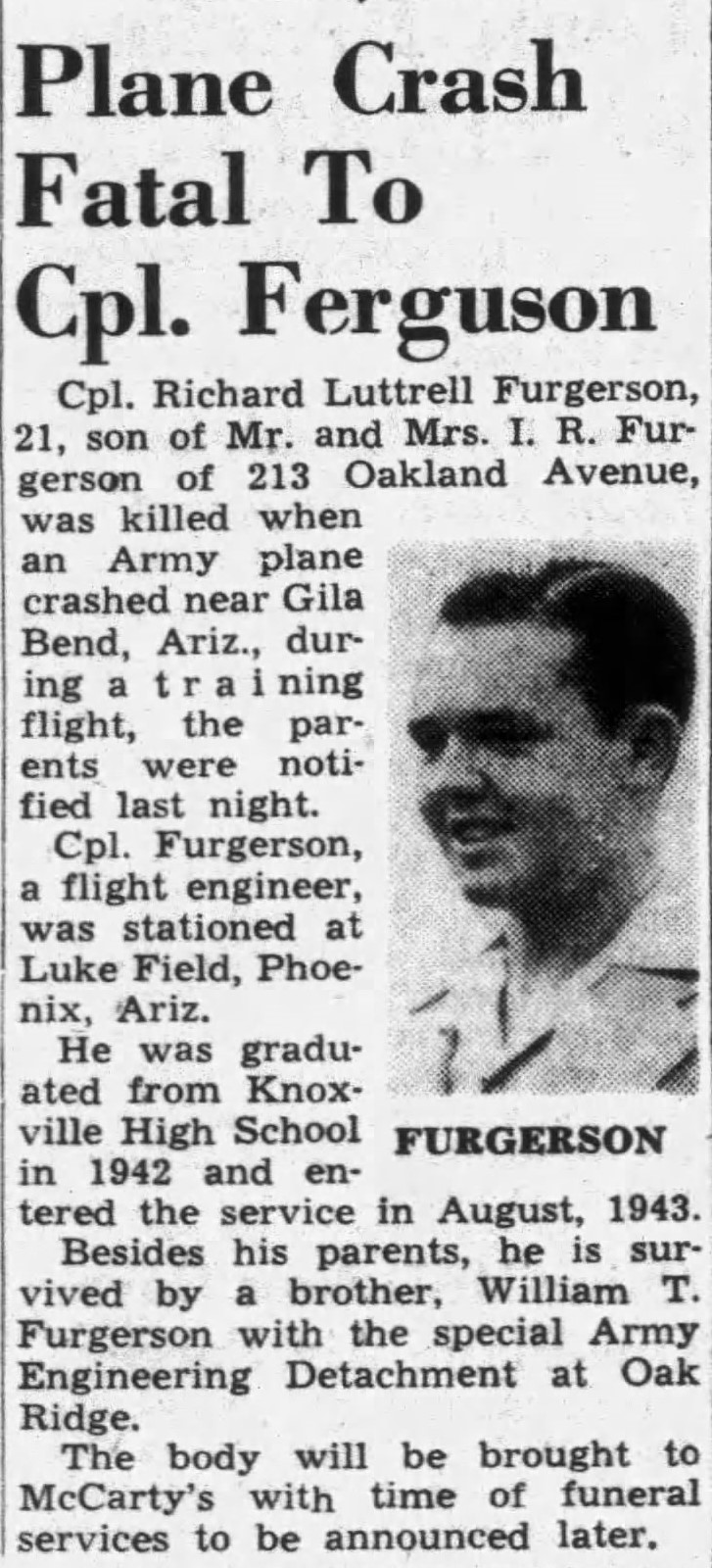 Cpl. Richard Luttrell Furgerson, 21, son of Mr. and mrs. I.R. Furgerson of 213 Oakland Avenue, was killed when an Army plane crashed near Gila Bend, Arizona, during a training flight, the parents were notified last night. Cpl. Furgerson, a flight engineer, was stationed at Luke Field, Phoenix, Ariz. He was graduated from Knoxville High School in 1942 and entered the service in August, 1943. Besides his parents, he is survived by a brother, William T. Furgerson with the special Army Engineering Detachment at Oak Ridge. The body will be brought to McCarty’s with time of funeral services to be announced later.