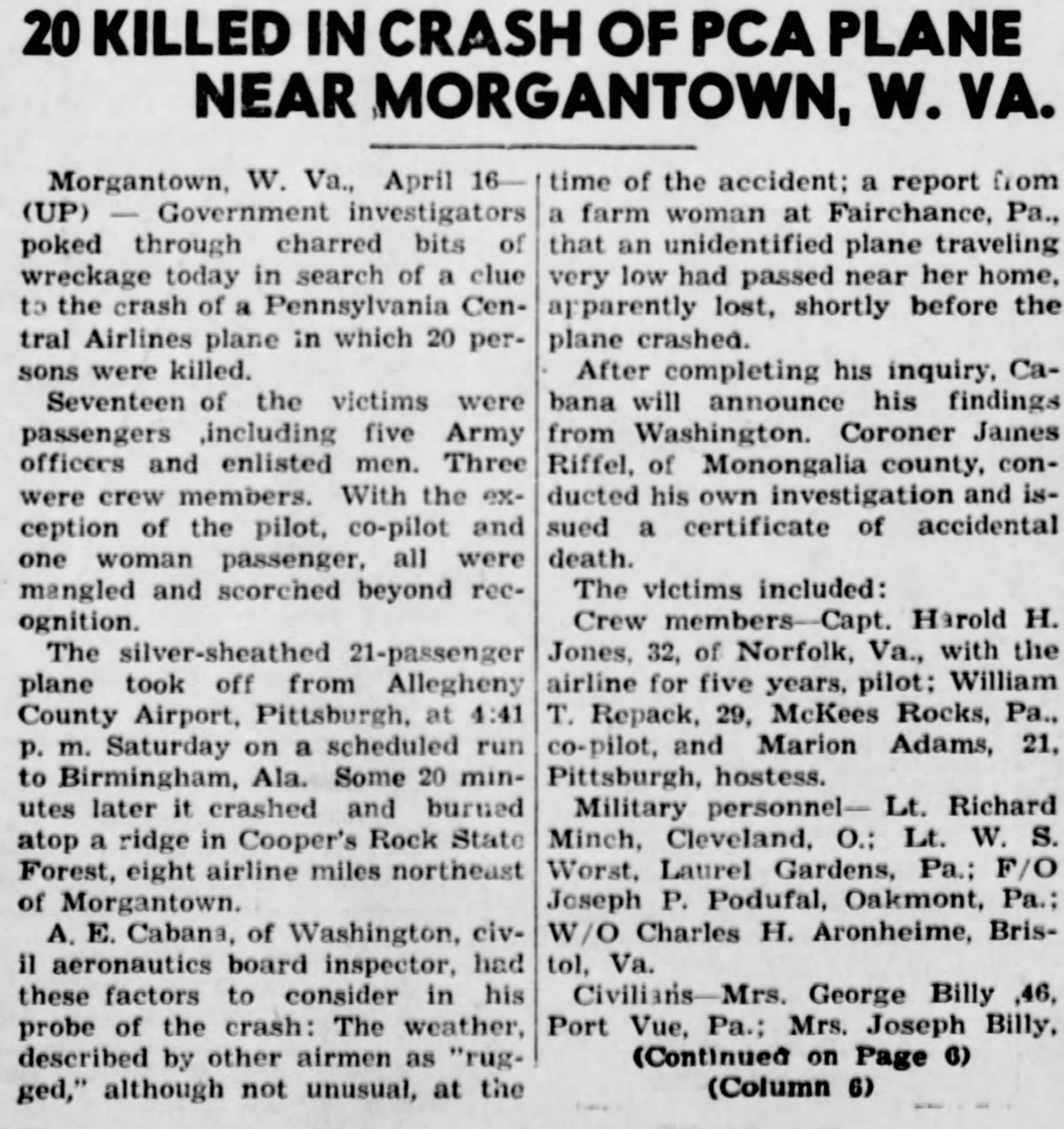 Morgantown (AP) — Pointing skyward, there remained today only a battered tailpiece and some scattered fragments of a storm-beset Pennsylvania Central Airline transport which crashed into a nearby mountain, carrying to an explosive death its 20 occupants. On a 2,200-foot ridge in Cooper’s Rock State Park, about 10 miles east of here, searchers found the bodies, most of them charred and mangled beyond recognition, strewn over 1,000 yards of thick underbrush.