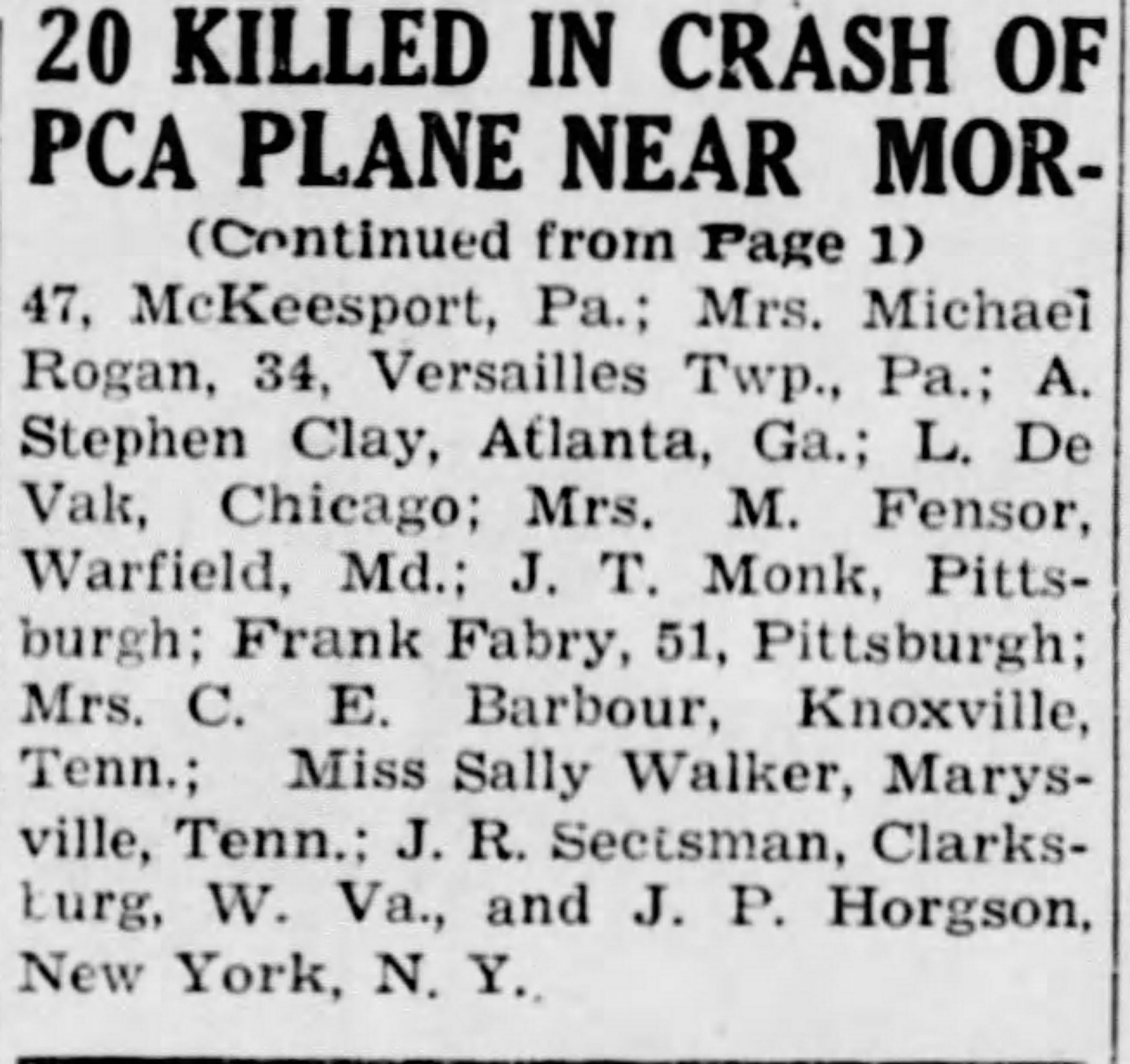 20 DIE AS PCA AIRLINER WRECKS ON WEST VIRGINIA MOUNTAINSIDE.