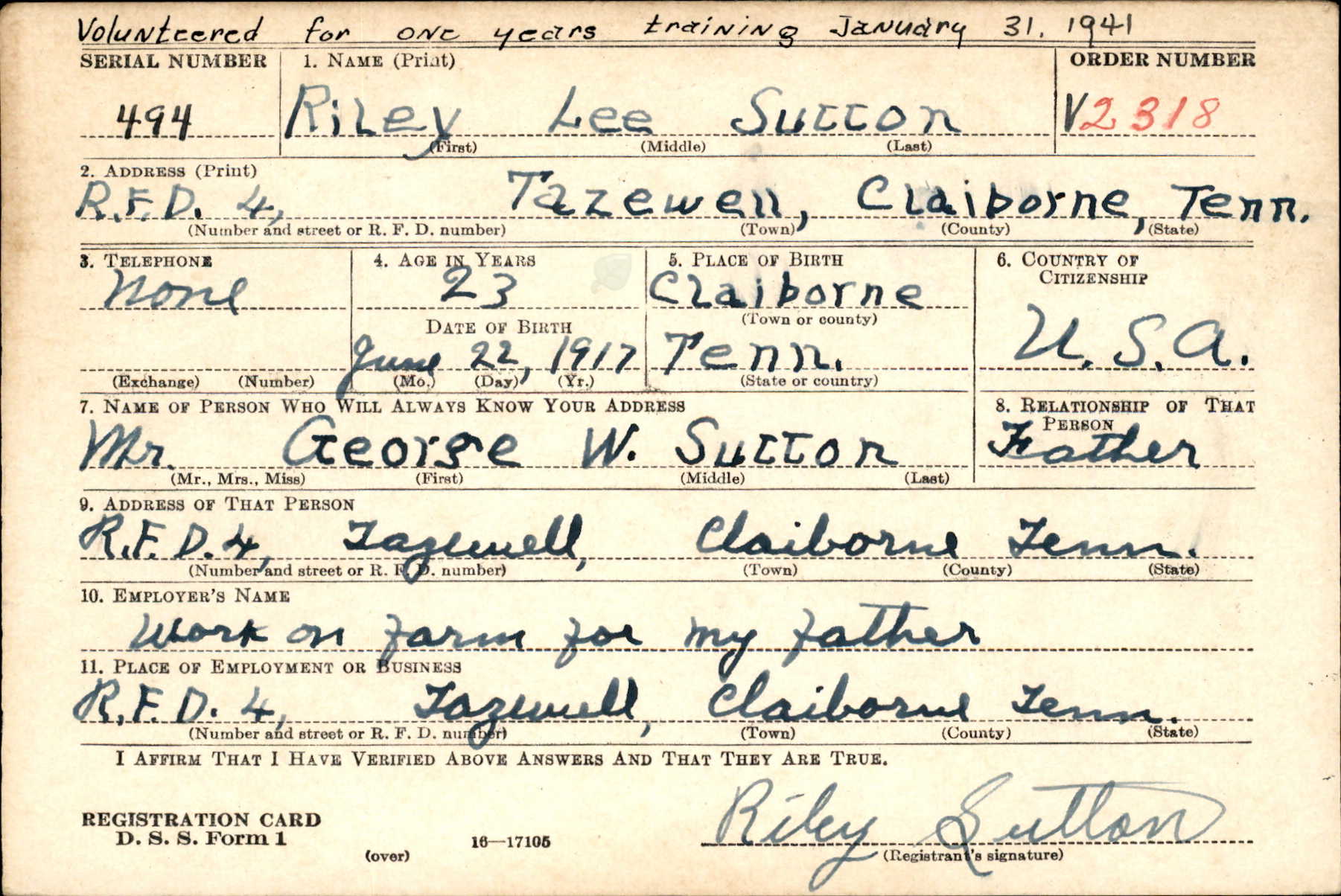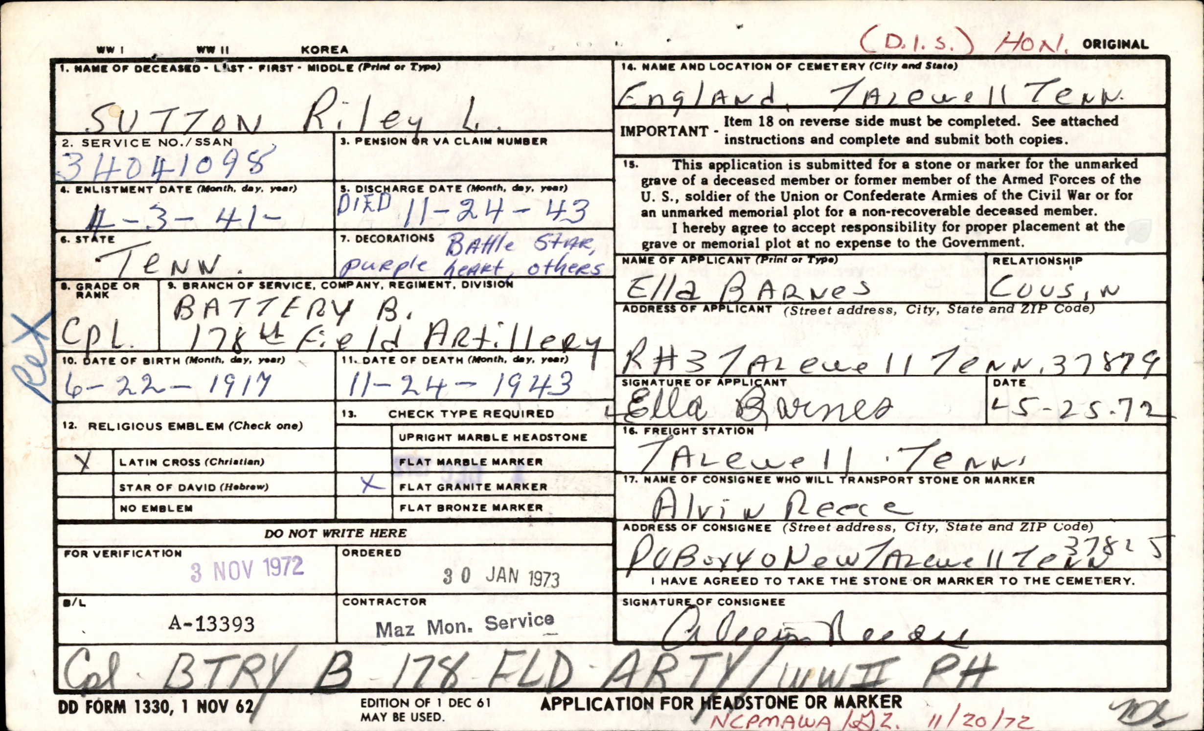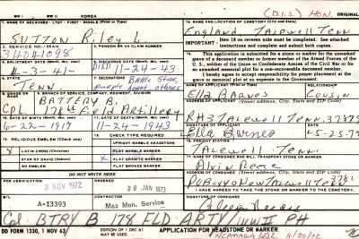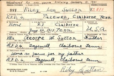 Riley Lee Sutton was born on 22 June 1917, the youngest son of George W. Sutton and Annie Owens Sutton He was killed in action during WWII in Italy on 24 November 1943. He was survived by his parents and one brother, Lon L. Sutton. He was a grandson of John Thomas Owens and Elizabeth Lanham Owens. He was a GGG-grandson of Abel Lanham (buried at the nearby Lambert Cemetery), a Revoluntary War Soldier.