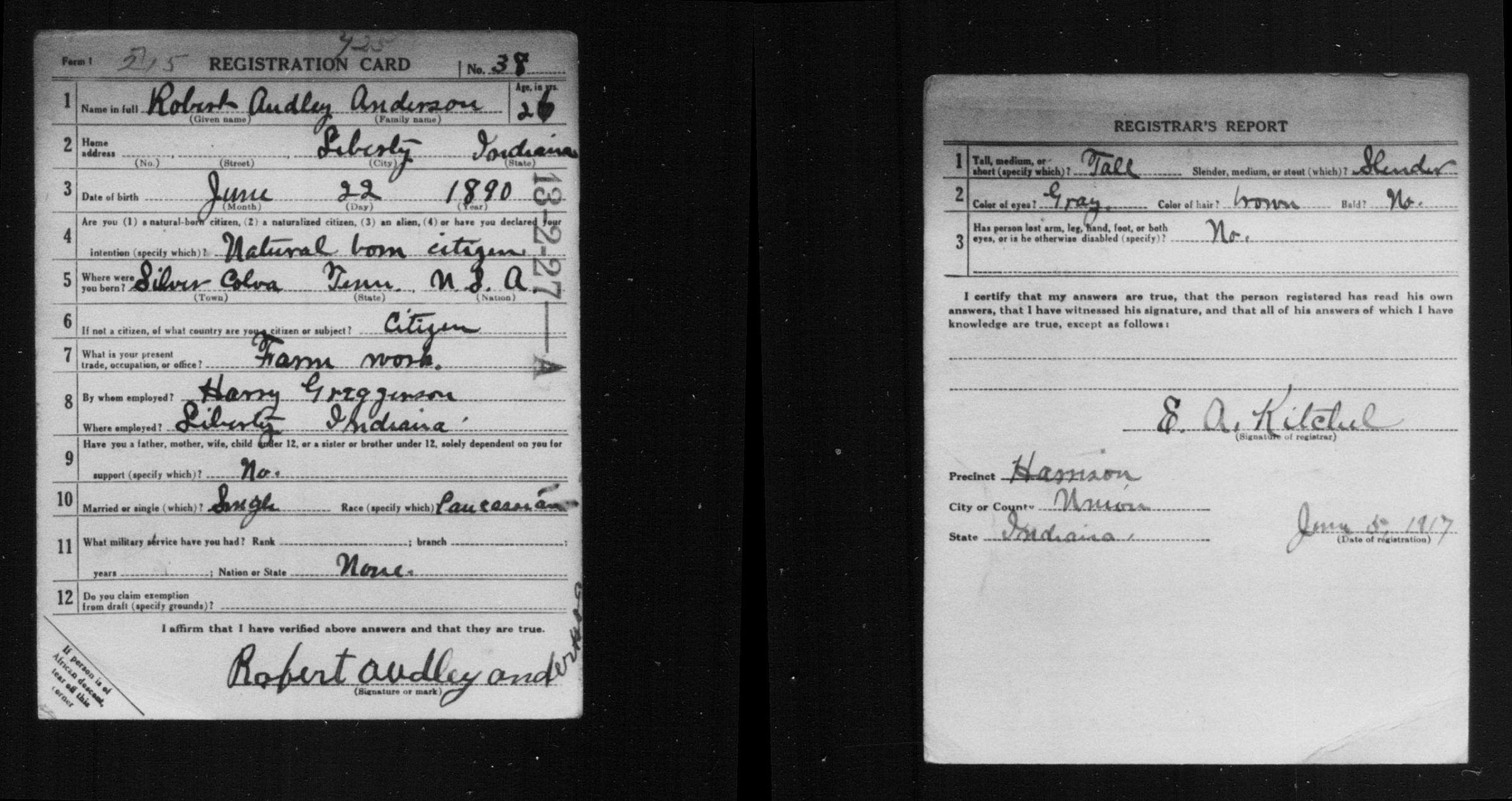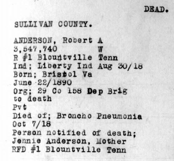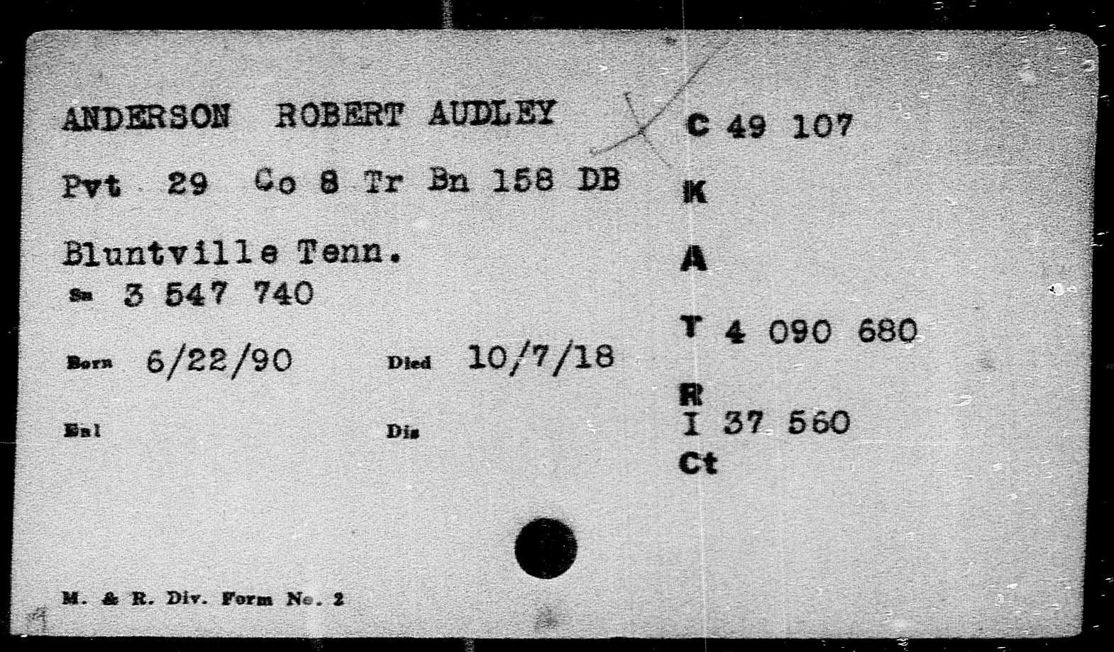 Robert Audley Anderson was born 22 June 1890 in Silver Colva, Sullivan County, Tennessee.