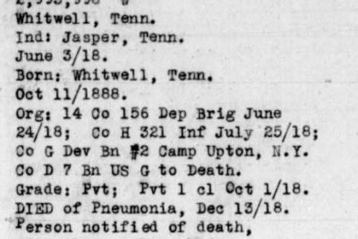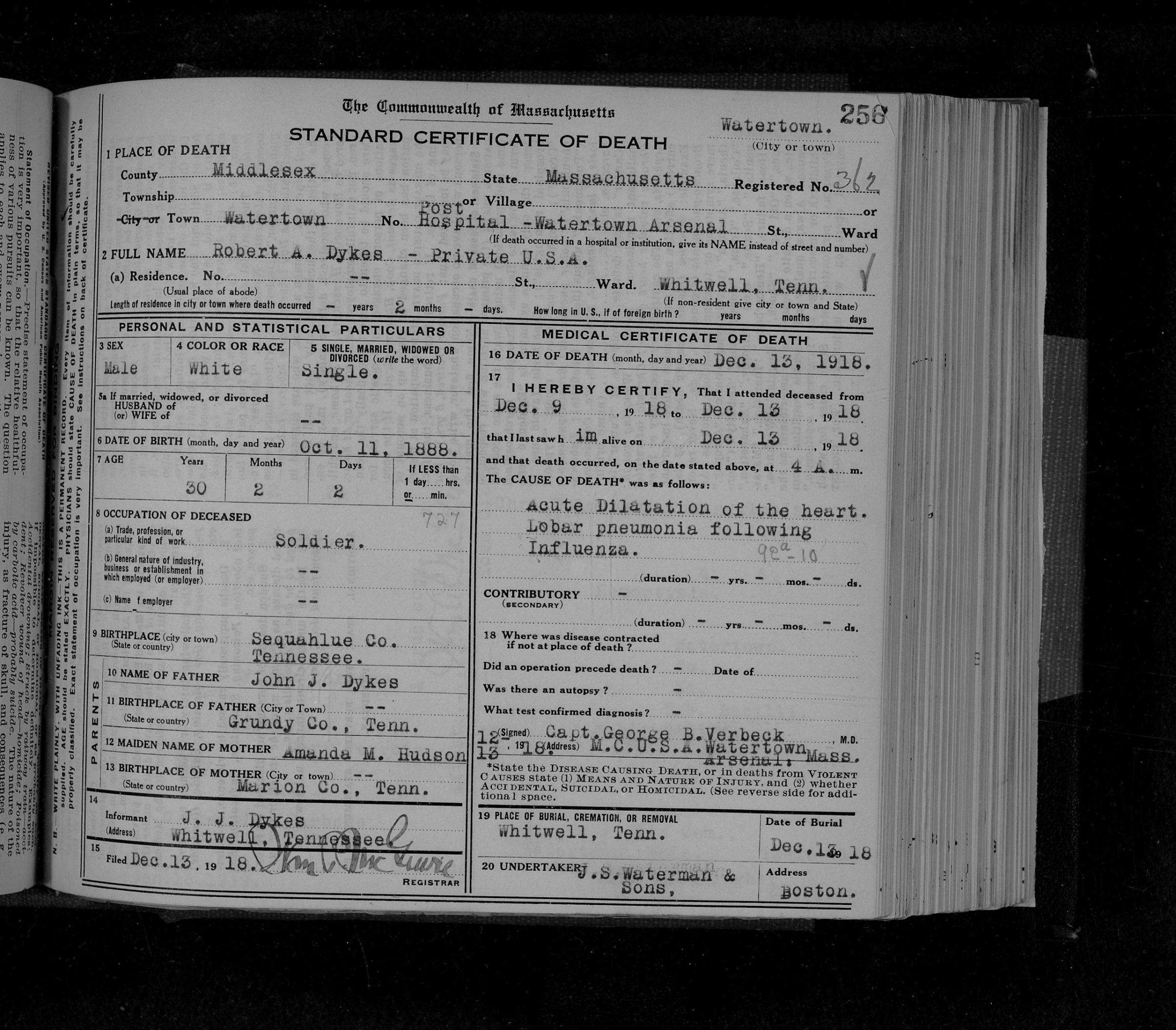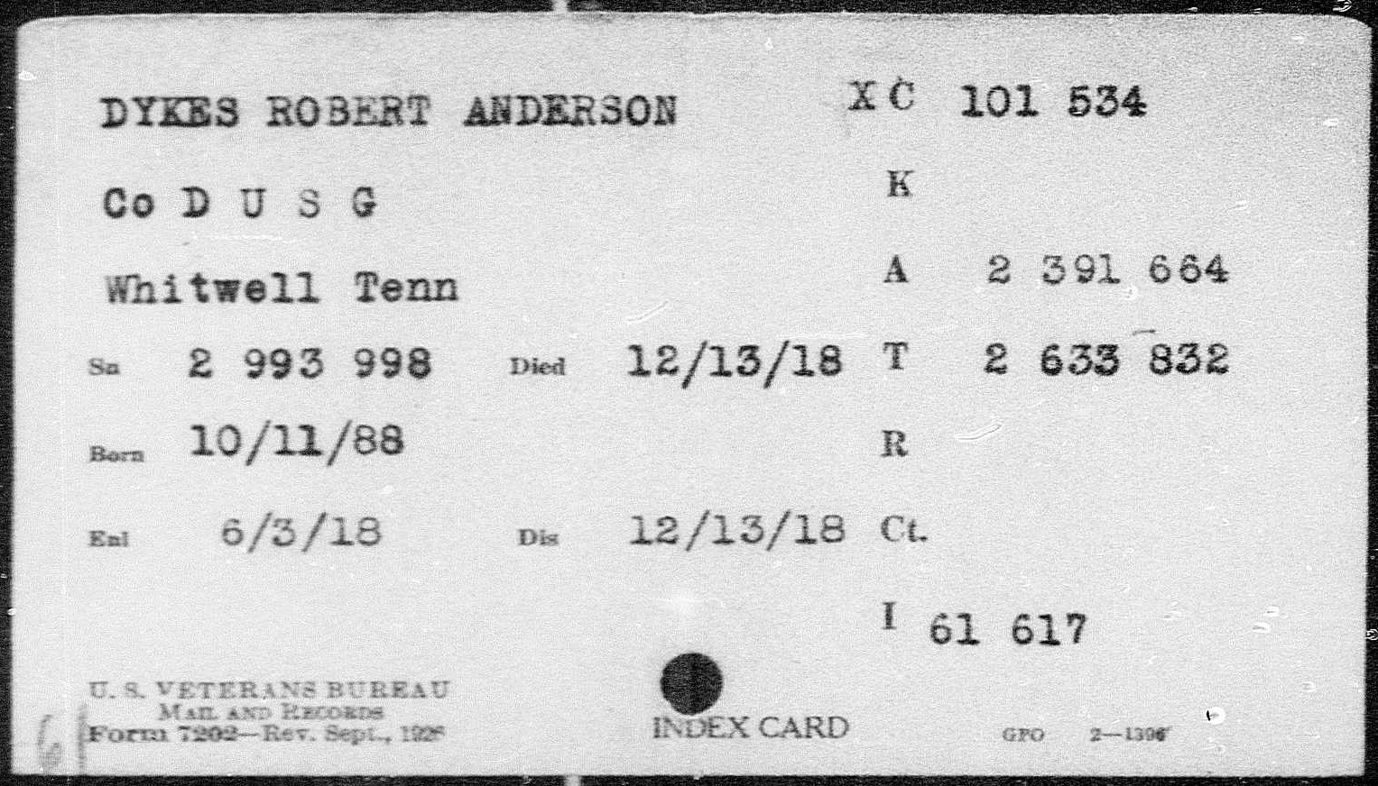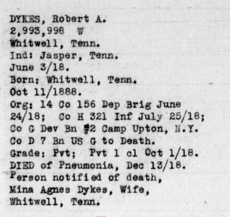 Robert Anderson Dykes was born 11 October 1888 in Whitwell, TN to son of John J. Dykes and Amanda M. Hudson. He was married to Mina Agnes Dykes. Pfc Dykes died at a hospital at Watertown, Middlesex, Massachusetts of pneumonia following influenza.