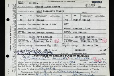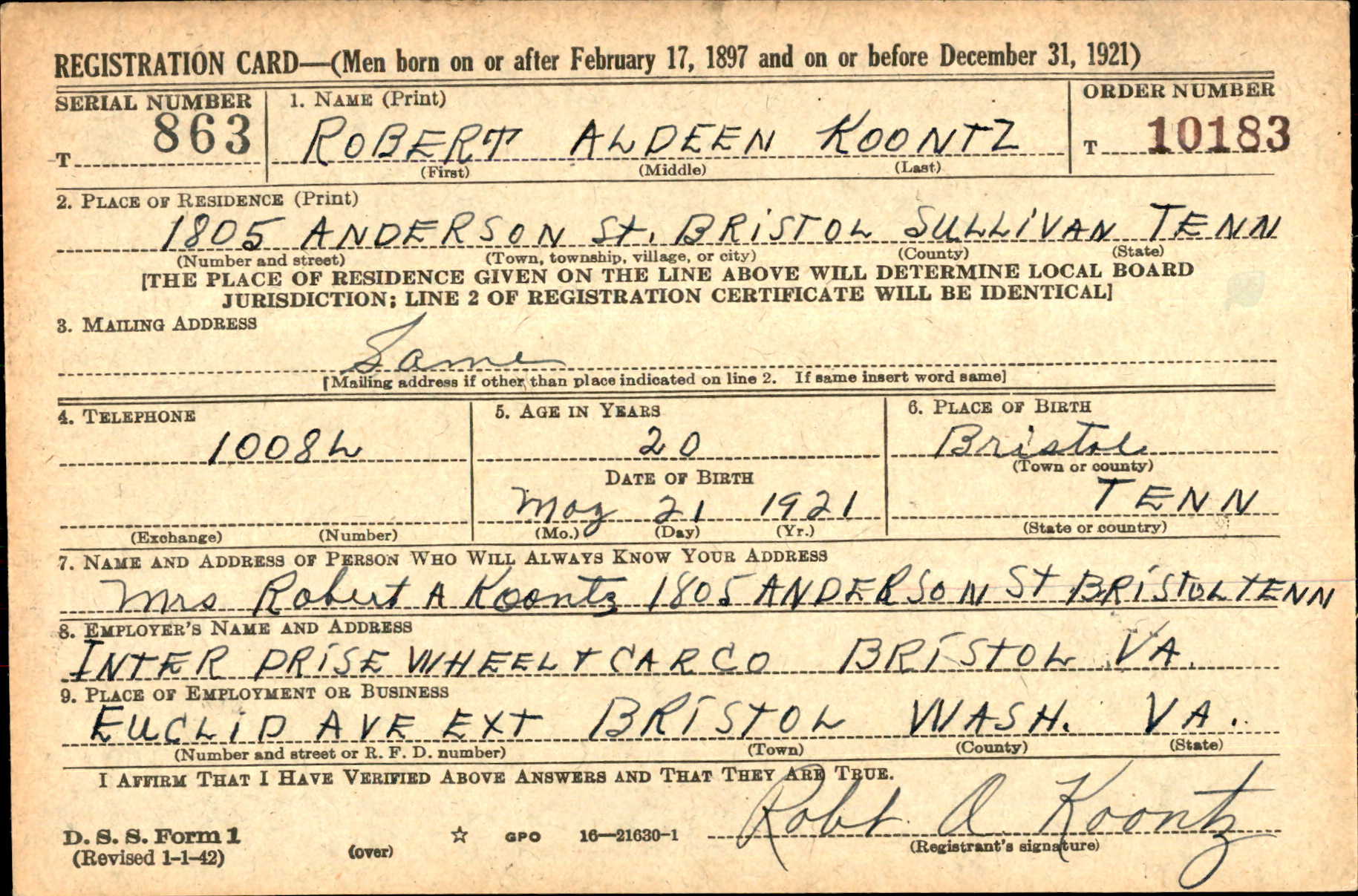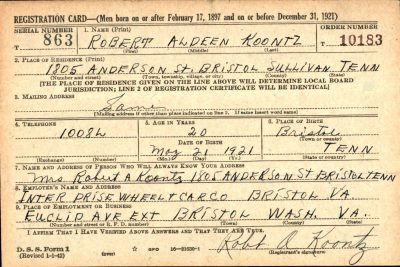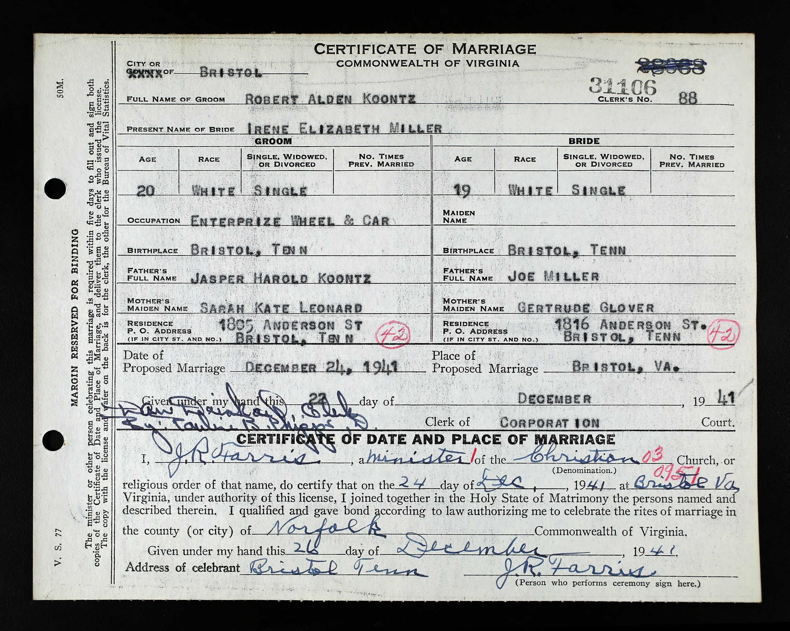 Robert Aldeen Koontz was the son of Jasper Harold Koontz and Sarah Kate Leonard. He married Irene Elizabeth Miller in Bristol, Virginia on 24 December 1941.
