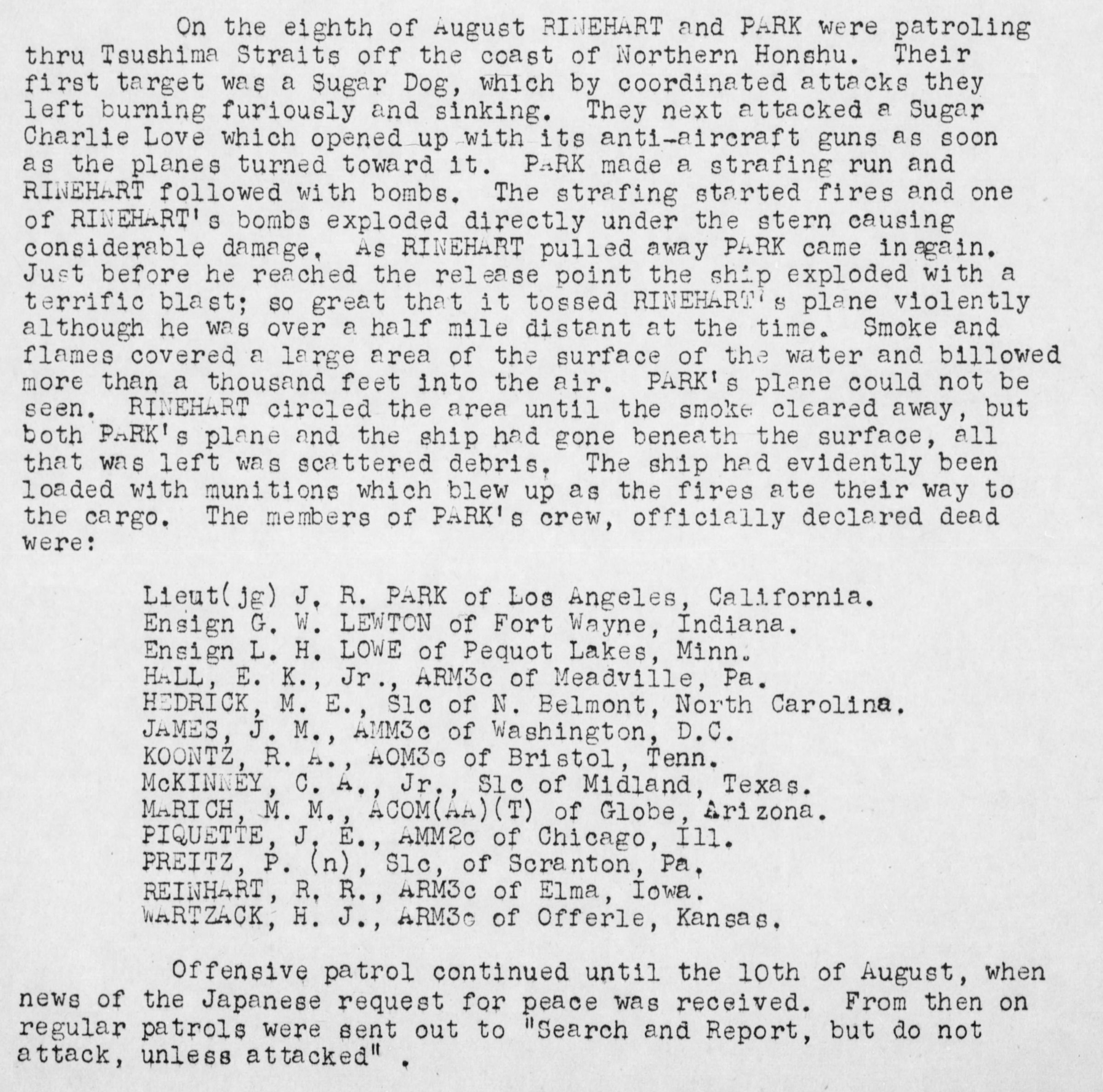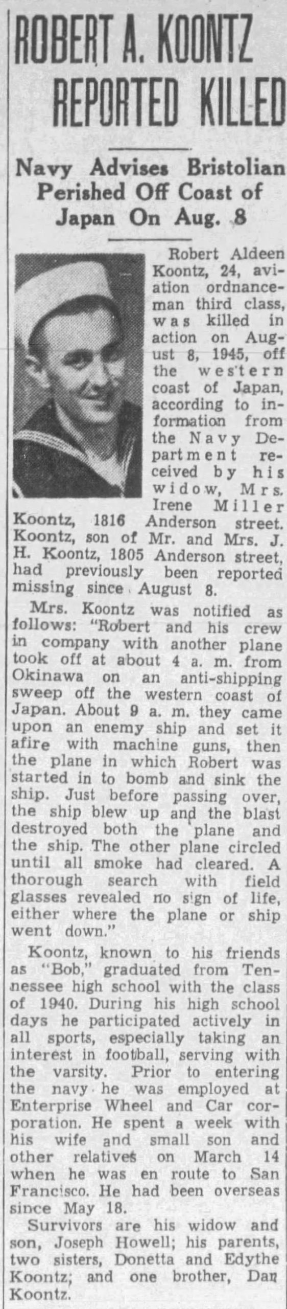Robert Aldeen Koontz, 24, aviation ordnanceman third class, was killed in action on August 8, 1945, off the western coast of Japan, according to information from the Navy Department received by his widow, Mrs. Irene Miller Koontz, 1816 Anderson street. Koontz, son of Mr. and Mrs. J.H. Koontz, 1805 Anderson street, had previously been reported missing since August 8. Mrs. Koontz was notified as follows; “Robert and his crew in company with another plane took off at about 4 a.m. from Okinawa on an anti-shipping sweep off the western coast of Japan. About 9 a.m. they came upon an enemy ship and set it afire with machine guns, then the plane in which Robert was started in to bomb and sink the ship. Just before passing over, the ship blew up and the blast destroyed both the plane and the ship. The other plane circled until all smoke had cleared. A thorough search with field glasses revealed no sigh of life, either where the plane or ship went down.” Koontz, known to his friends as “Bob,” graduated from Tennessee high school with the class of 1940. During his high school days he participated actively in all sports, especially taking an interest in football, serving with the varsity. Prior to entering the navy he was employed at Enterprise Wheel and Car corporation. He spent a week with his wife and small son and other relatives on March 14 when he was en route to San Francisco. He had been overseas since May 18. Survivors are his widow and his son, Joseph Howell; his parents, two sisters, Donetta and Edythe Koontz and one brother, Dan Koontz.