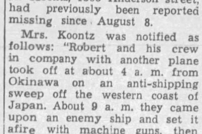 Mrs. Robert A. Koontz has received word that her husband Robert A. Koontz, Aviation Ordnanceman 3-c USN, has been missing since August 8. He has been overseas since May 18, 1945. He is the son of Jasper H. Koontz, 1805 Anderson street. His wife and small son live at 1816 Anderson street with her parents, Mr. and Mrs. Joe Miller.