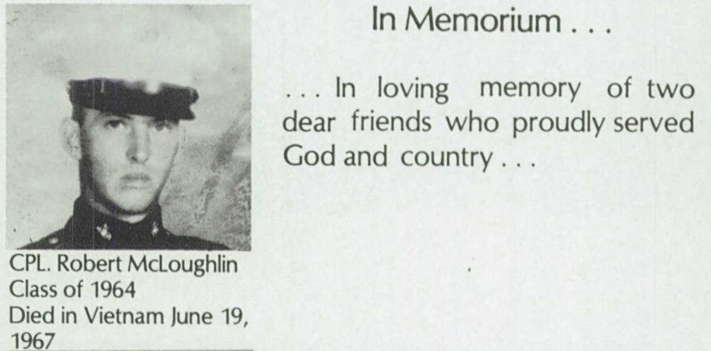 Corporal Robert A. McLoughlin, Jr. was born in Detroit, MI, November 21, 1946. He was a graduate of Knoxville Catholic High School and attended East Tennessee State University, Johnson City for one year prior to entering the US Marines in August 1966. He was a member of Holy Ghost Catholic Church. Cpl. McLoughlin had left Knoxville April 3, 1968, for Vietnam and was killed June 19, 1968, by mortar fire in the Quang Tri province of Vietnam. Burial was at Calvary Cemetery in Knoxville.